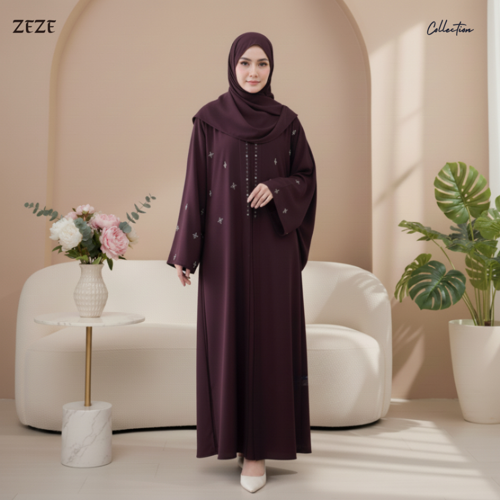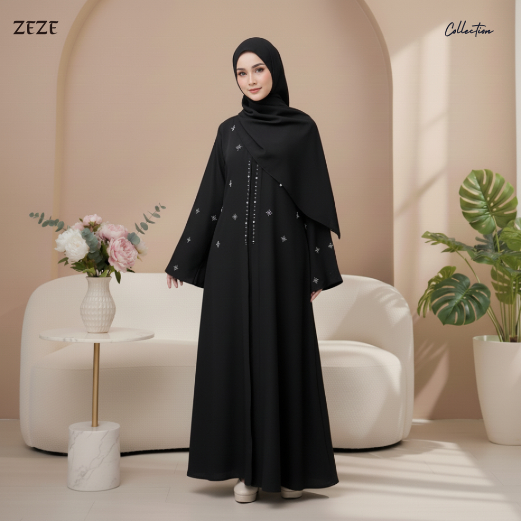 Zeze - SHELLA ABAYA Ceruty Babydoll Full furing Aksen Payet Aplikasi Mutiara Gamis Warna Smoke