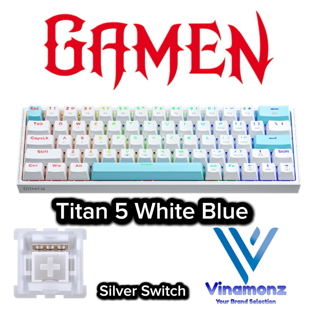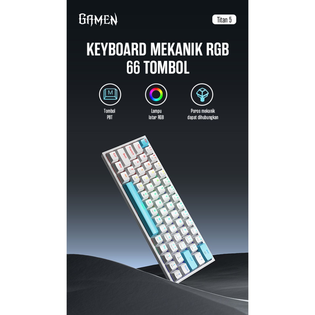 GAMEN TITAN 5 KEYBOARD GAMING MECHANICAL – 60 PERSEN LAY – -SWAPPABLE – PBT – SILVER SWITCH – WHITE X BLUE – RGB LIGHT – ANTI-GHOSTING FULL KEY
