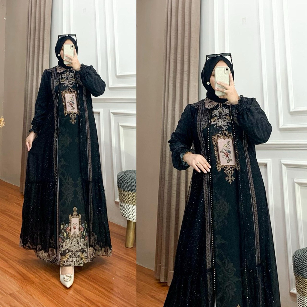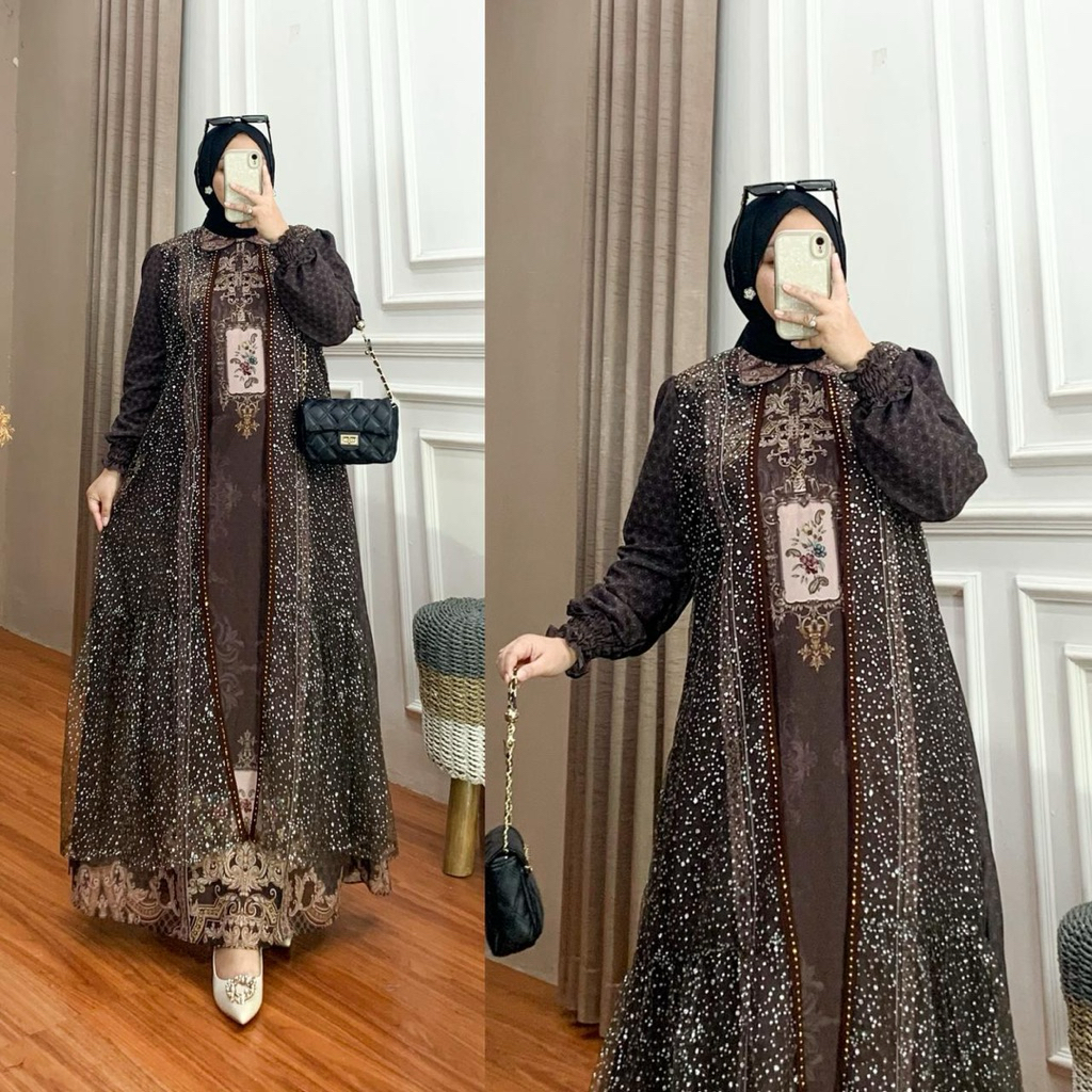 KINAN DRESS GAMIS LEBARAN TILE CERUTY PRINTING MEWAH SULTAN TERBARU ELEGAN KONDANGAN