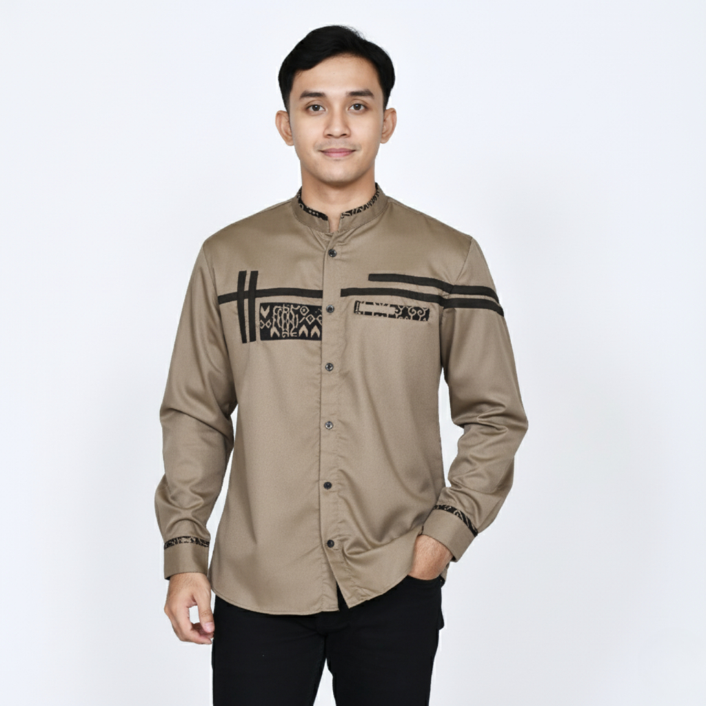 Baju Koko Pria Dewasa Lengan Panjang Warna Coklat Motif Katulistiwa Elrumi Katun