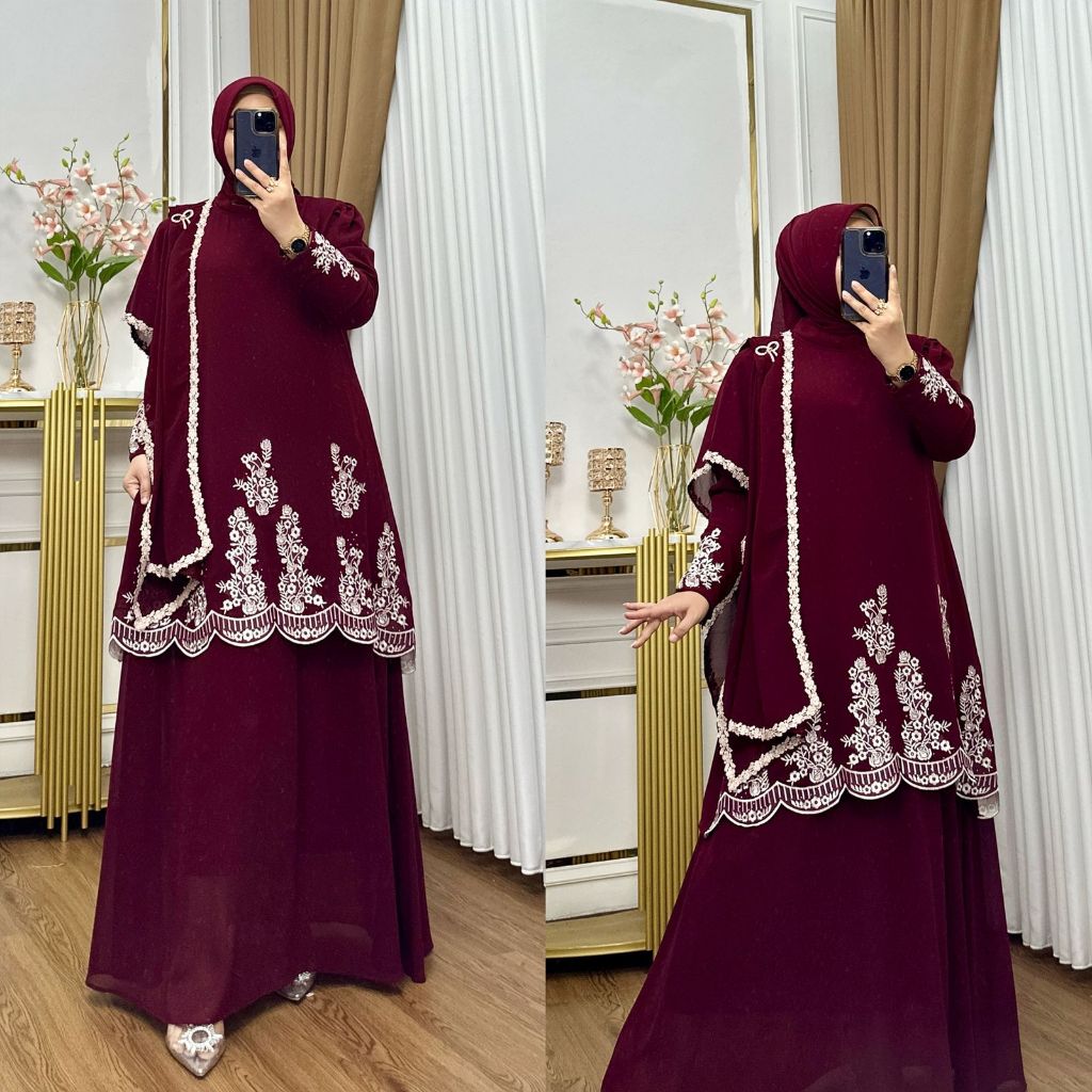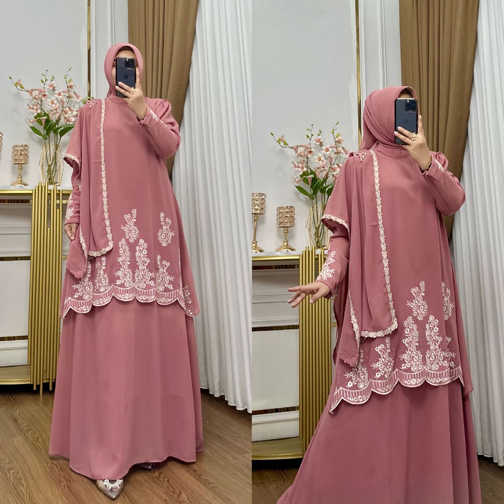Gamis Bordir Arafah Set Hijab Ceruty Premium Kombinasi Payet Mutiara
