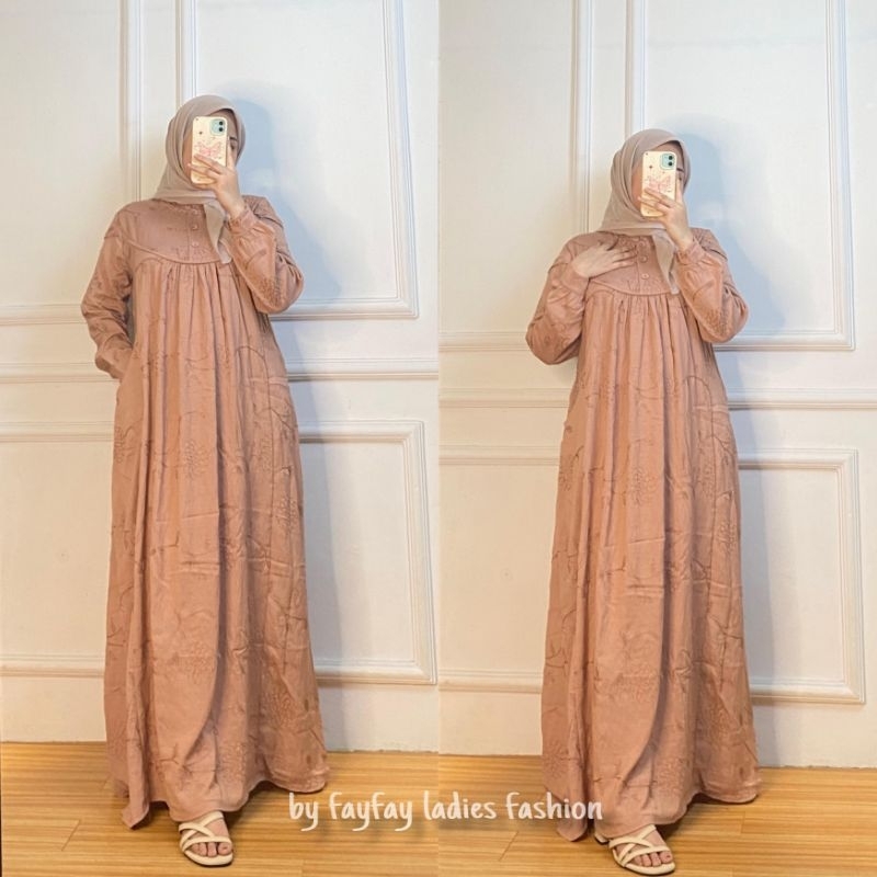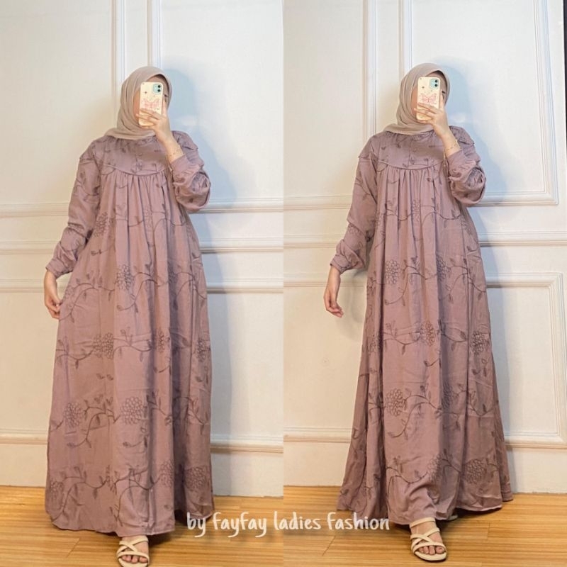 Fay Fay Amanda Baju Gamis Maxi Dress Muslim Polo Linen Full Bordir Premium High Quality Kancing Depan