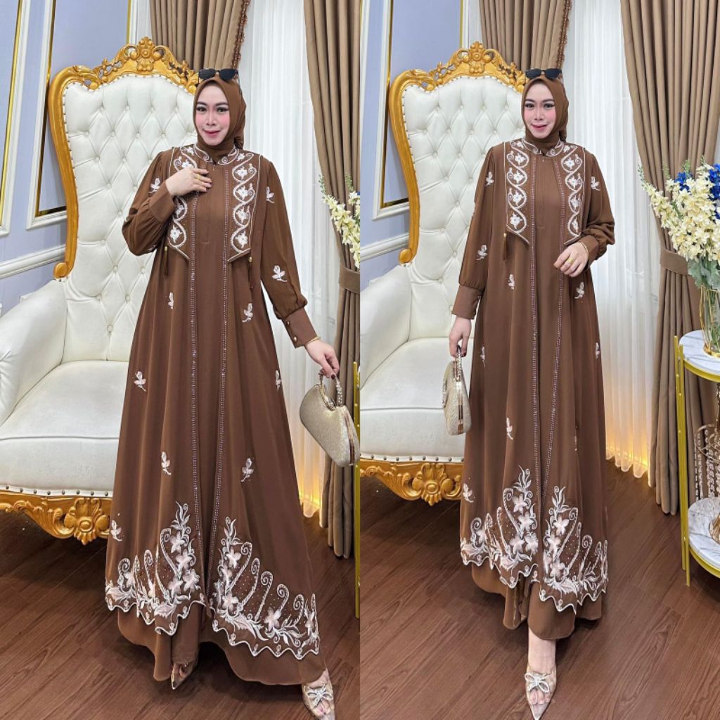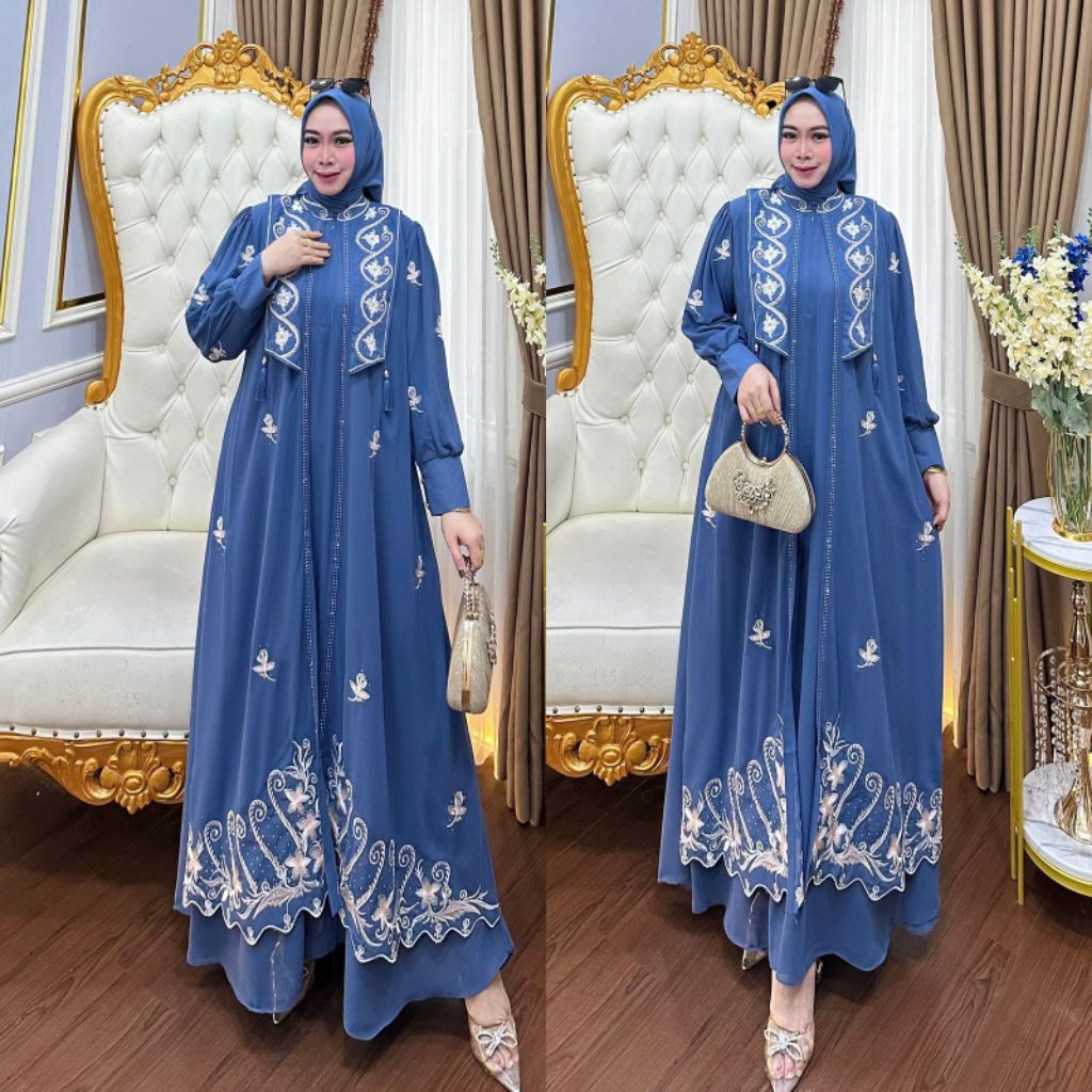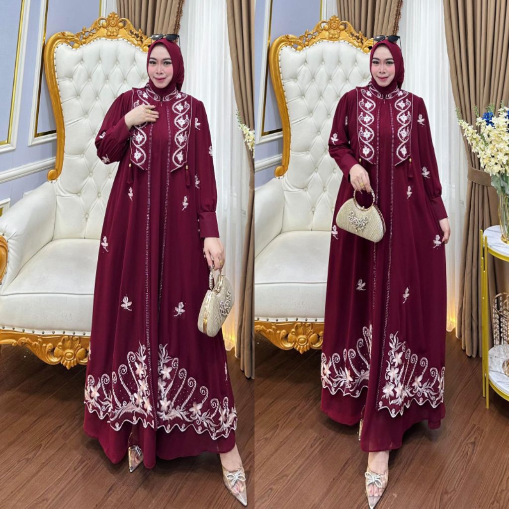 Gamis Raina Set Hijab Dress Muslim Wanita Motif Bordiran Plus Payet Permata Swarosky Premium Terbaru