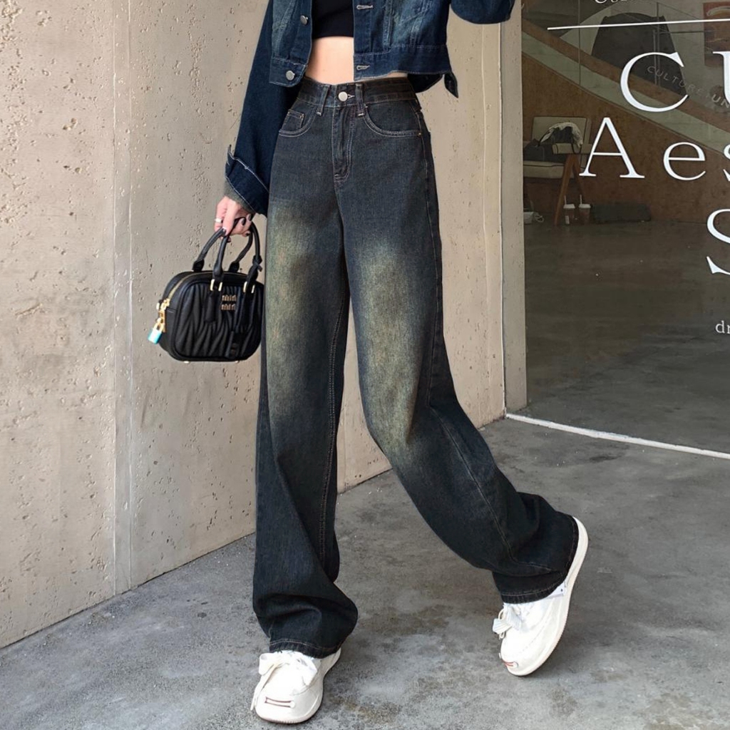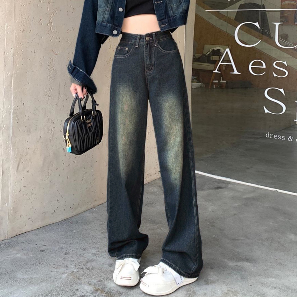 Retro Straight Celana Jeans Terbaru Wanita Loose Thin High Waisted Wide Leg Denim Pants