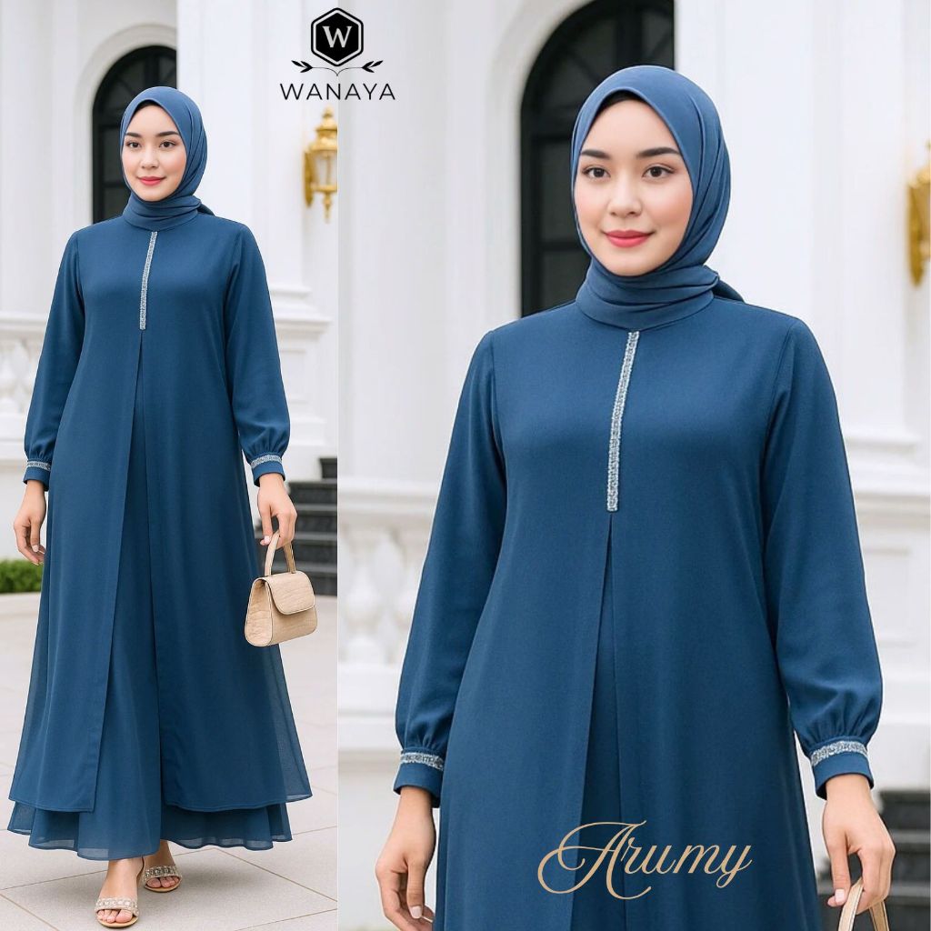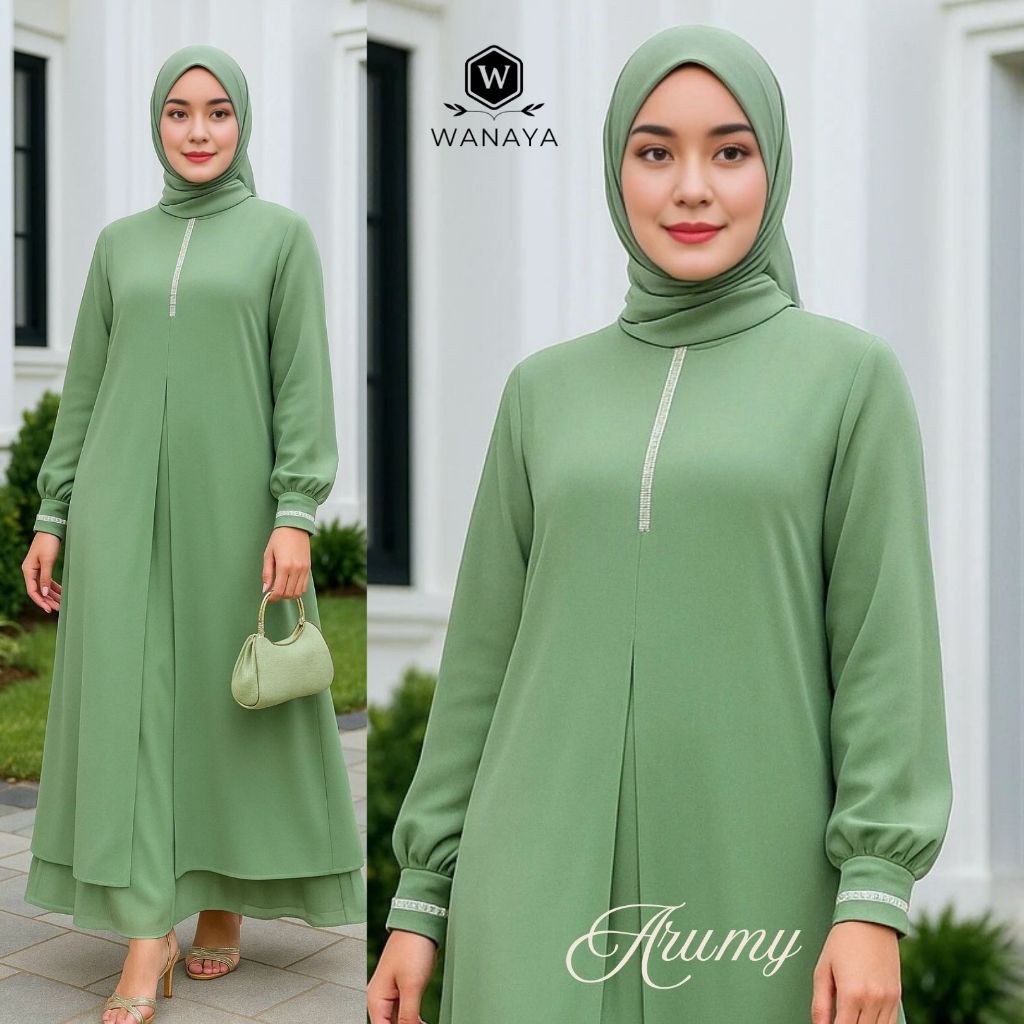 New Gamis Abaya Trendy Arumy Ceruty Babydoll Hitam Putih Full Puring Fitur Payet Kristal Swarovski