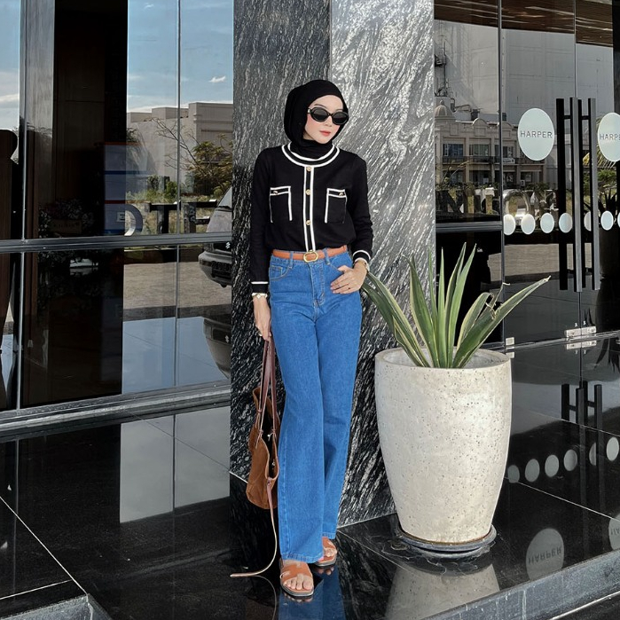 Shenelin celana panjang jeans wanita kekinian denim biru putih hitam black white denim Signature Highwaist Loose
