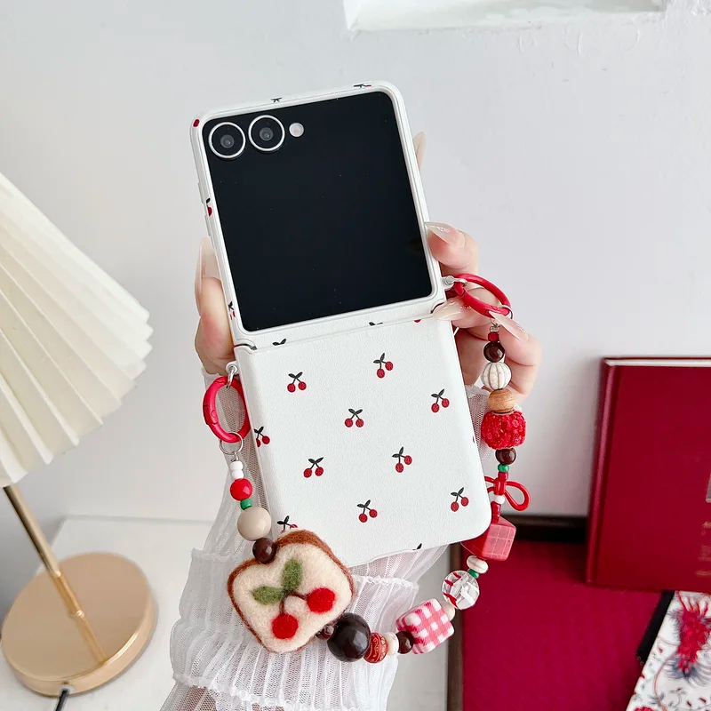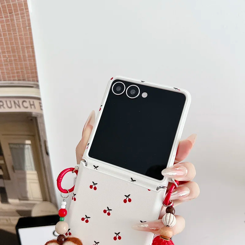 For Samsung Galaxy Zflip7 Z Flip 7 6 5 Zflip6 Flip5 5G Case Cute Fruit Cherry With Wrist Strap Phone Accessories