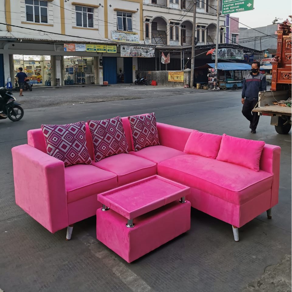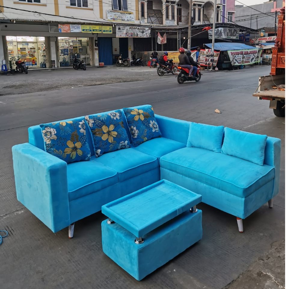 Sofa L Minimalis Kaki Kayu/ Sofa L Putus Retro/ Sofa L Santai Bahan Beludru Halus