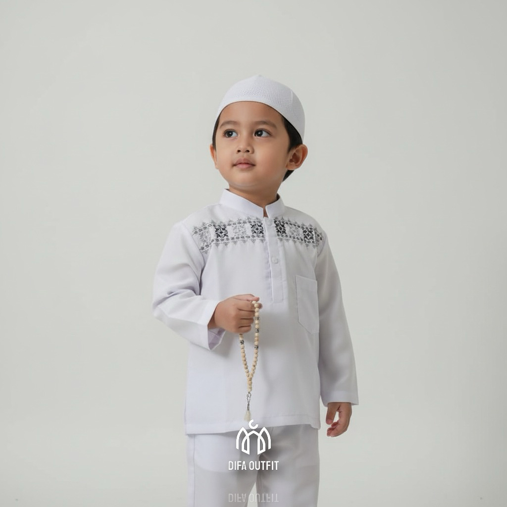 stelan baju koko putih anak laki laki dengan bordir