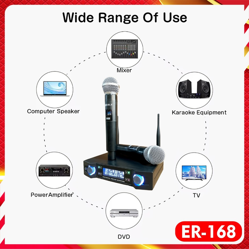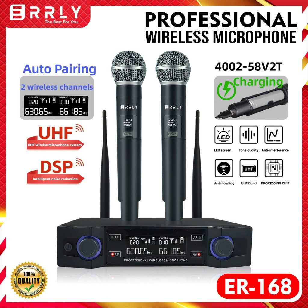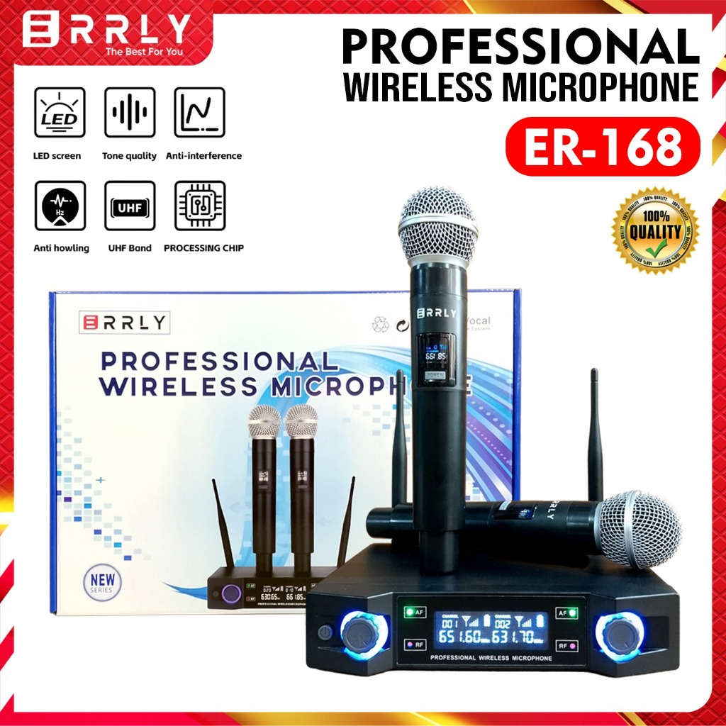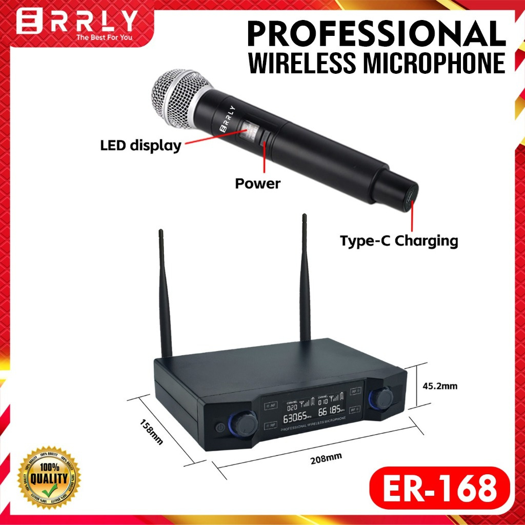 ERRLY Microphone Wireless ER-168 UHF Dual Mic + amplifier Receiver Digital LED Profesional Chargeable Mikrofon Nirkabel