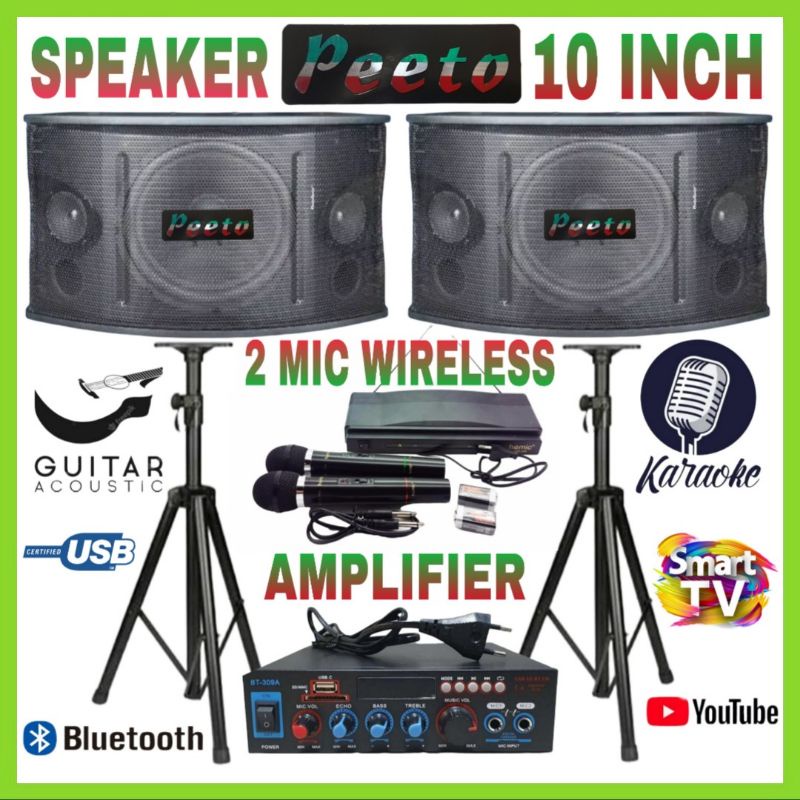 Paket Speaker PEETO 10 Inch 2 Mic Wireless Ampli Karaoke Smart Tv Youtube