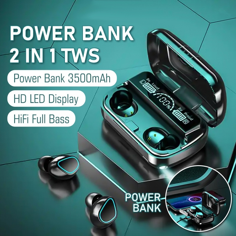WS-M10 Headset Bluetooth Full Bass Stereo 3500mAh Power Bank Wireless Earphone Tahan Air TWS With Mic Headphones Handset