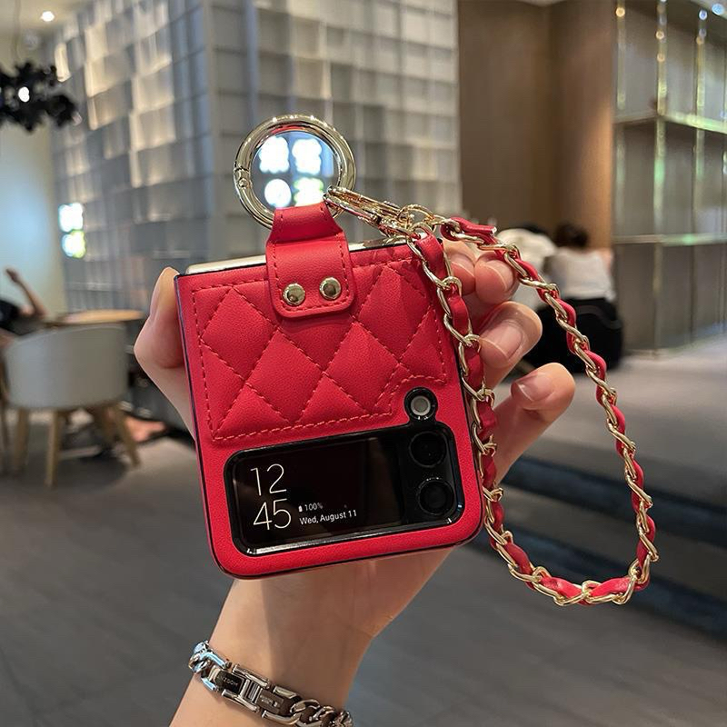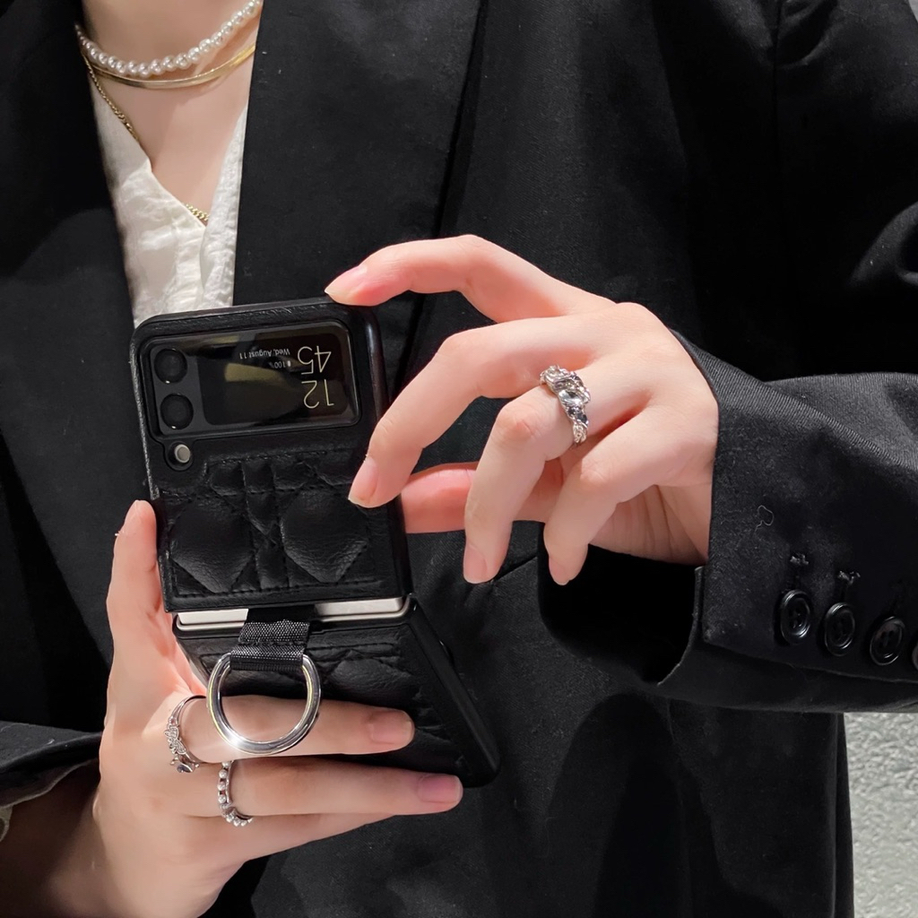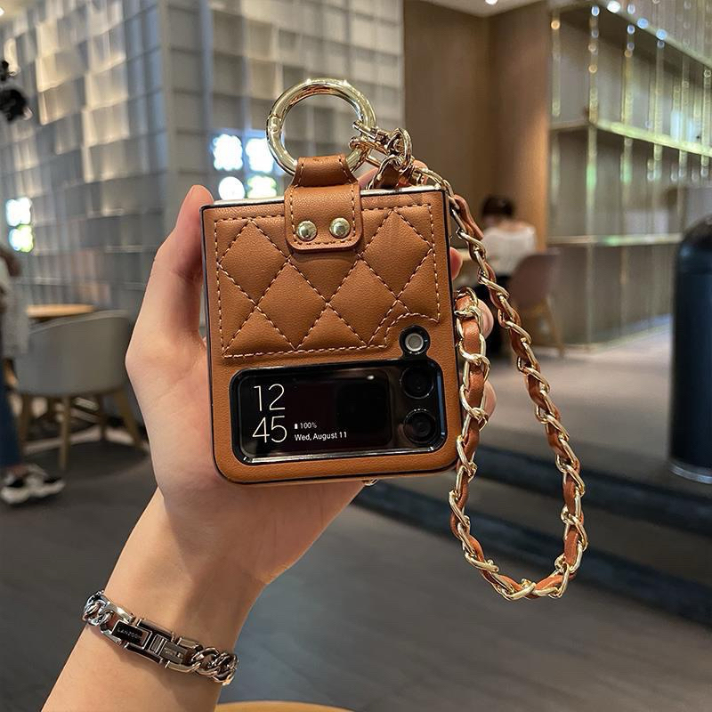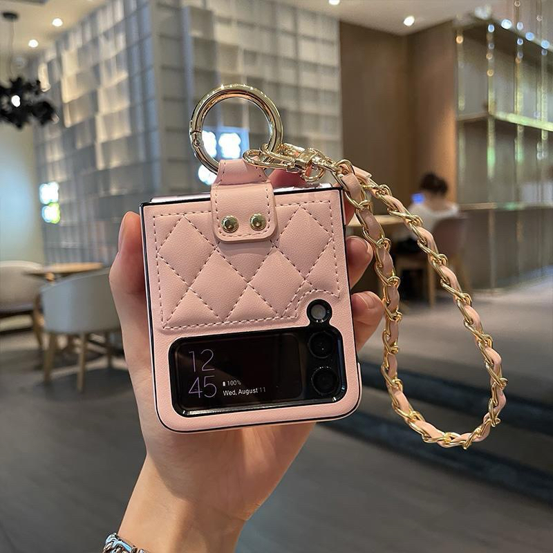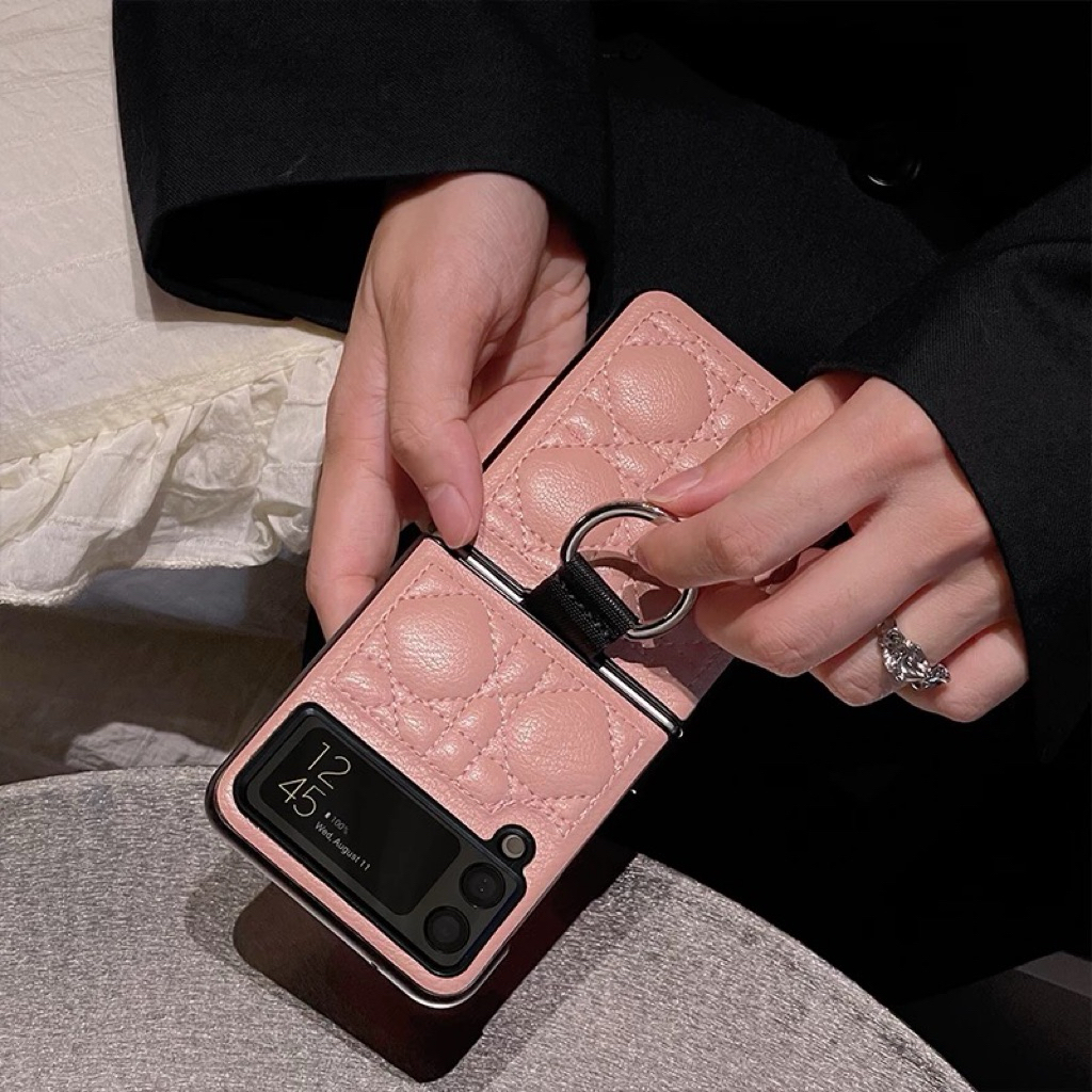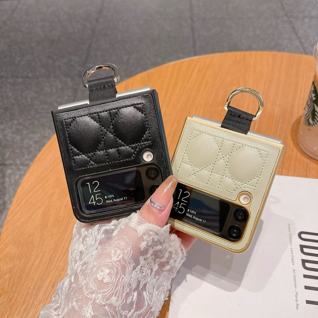 Case Samsung Z Flip 7 6 5 4 3 Bahan Lether Motif Quilt Dengan Tali Gantungan