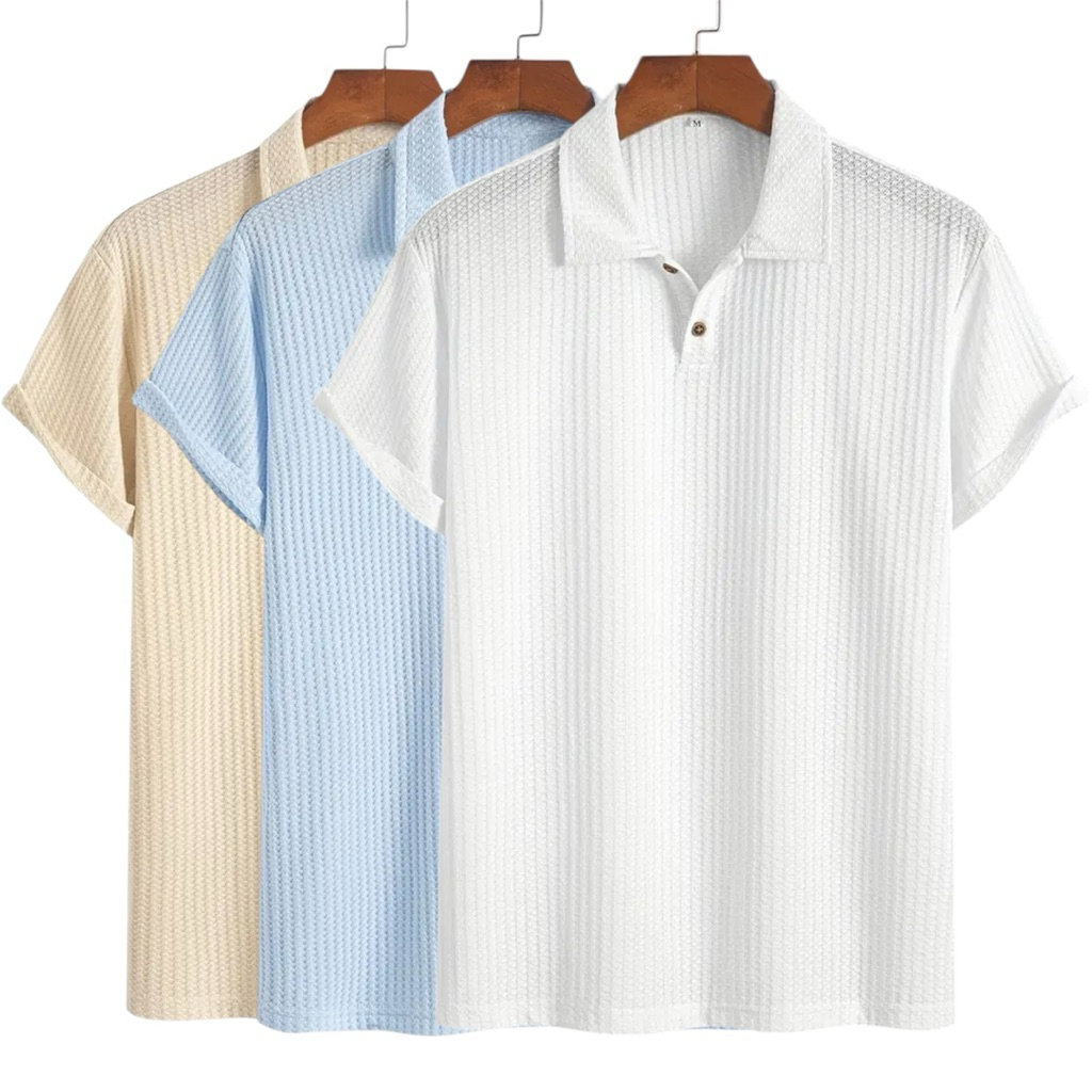 Paket 3 Pcs Kaos Polo Waffle Shirt Knit Pria Lengan Pendek Dengan Detail Berkancing Warna Solid Baju Kerah Pria Dewasa