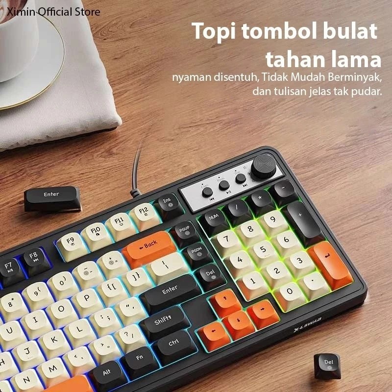KEYBOARD GAMING K98 E-SRTS JERMAN DENGAN KABEL, SWITCH COKLAT, SENYAP, SENSASI MEKANIS, DAN NIRKABEL.