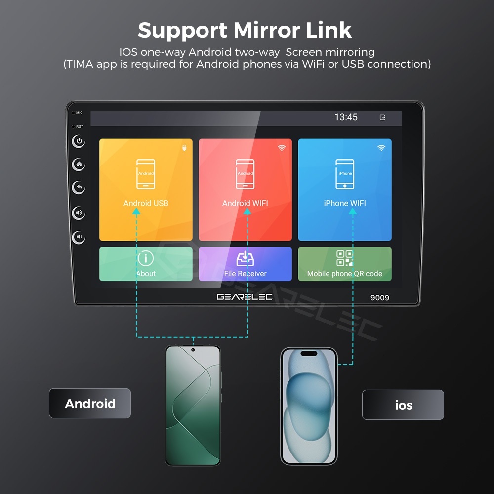 GEARELEC Double Din Universal Android13 Head Unit 9inci 4+64G Support GPS/Youtube/WIFI/48 Tema