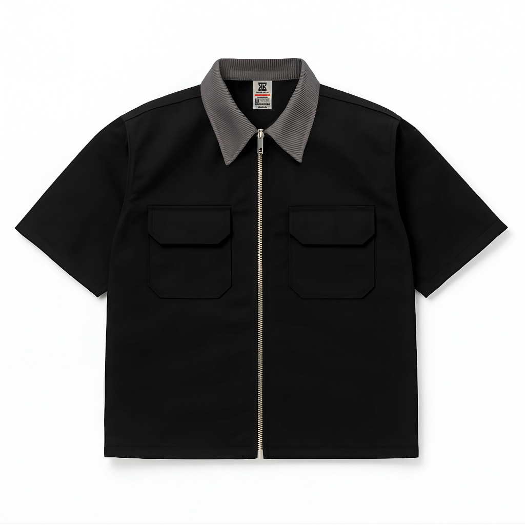 Raden Skygo Boxy Workshirt Oversize Kerah Salur Corduroy Zipper Ykk Black