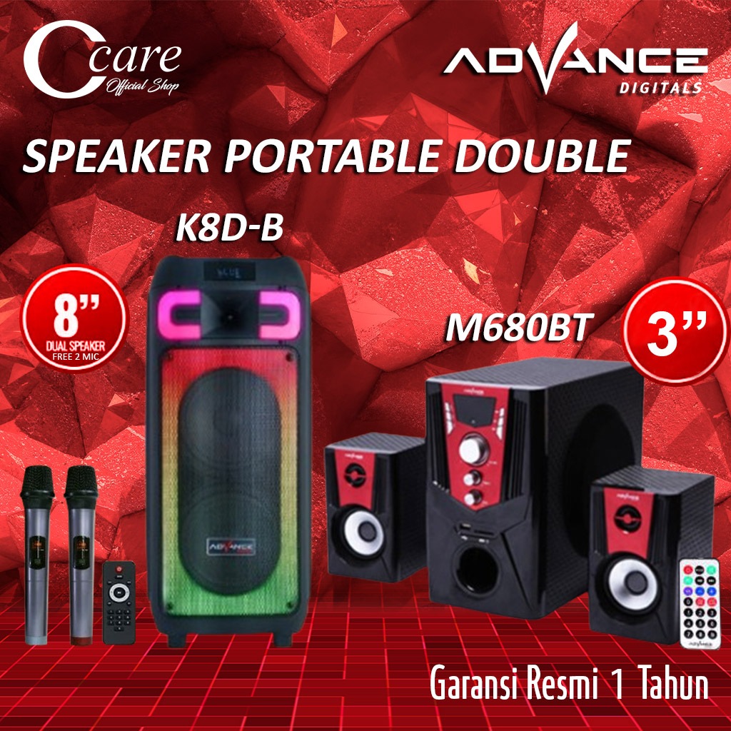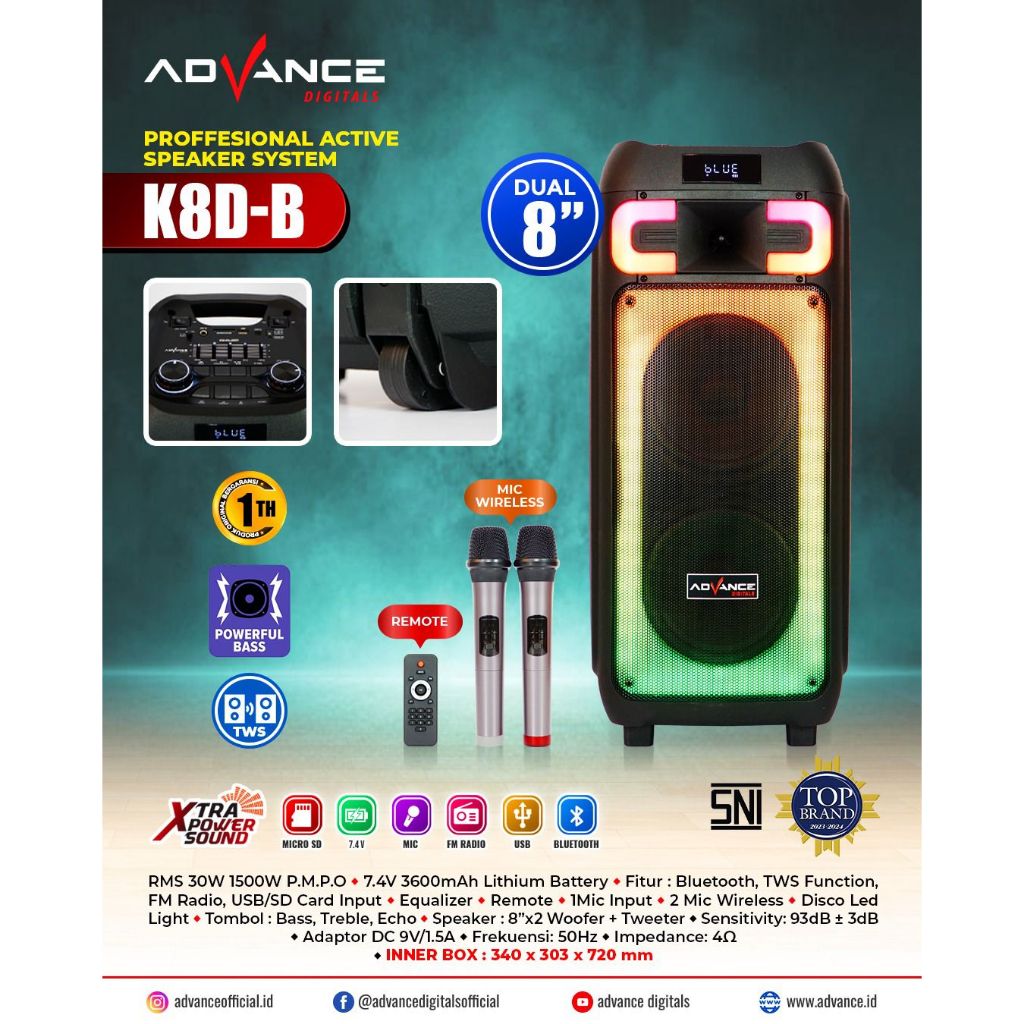 ADVANCE SPEAKER PORTABLE DOUBLE 8 INCH K8D-B BONUS 2 MIC