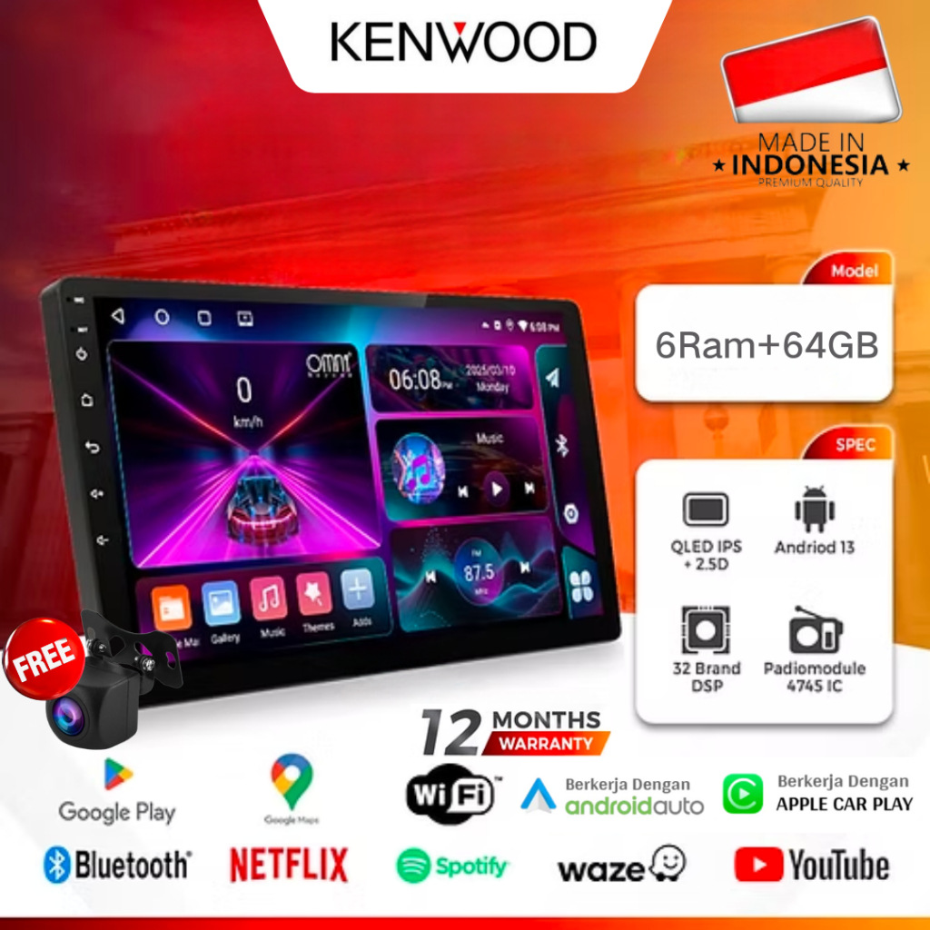 [ KIPAS GANDA ] Kenwood 6G+64G Android 14 FHD 8 Core Android Car Player dengan Kamera mundur Gratis