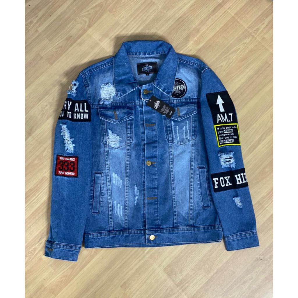 JAKET JEANS PRIA EL TERBARU JEANS SOBEK TEMPEL EMBLEM JAKET JEANS COWOK CEWEK BANDUNG MURAH DISTRO