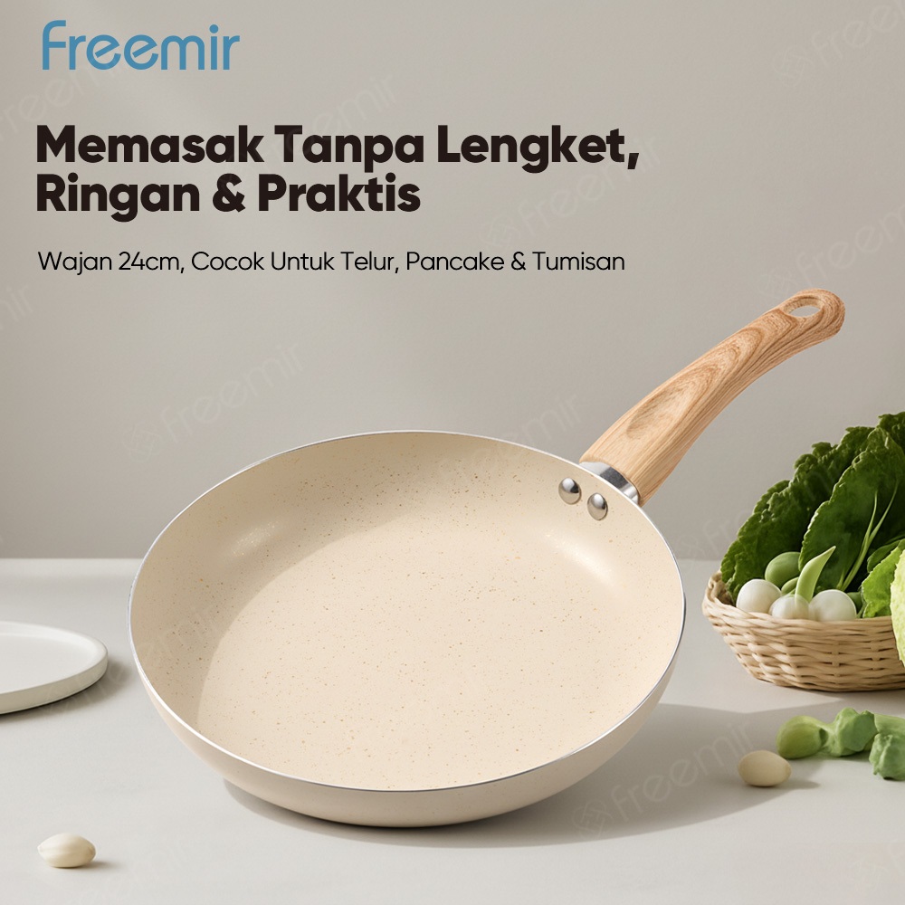 freemir Wajan Penggorengan 24cm Warna Krem Beige Anti Lengket dengan gagang serat kayu