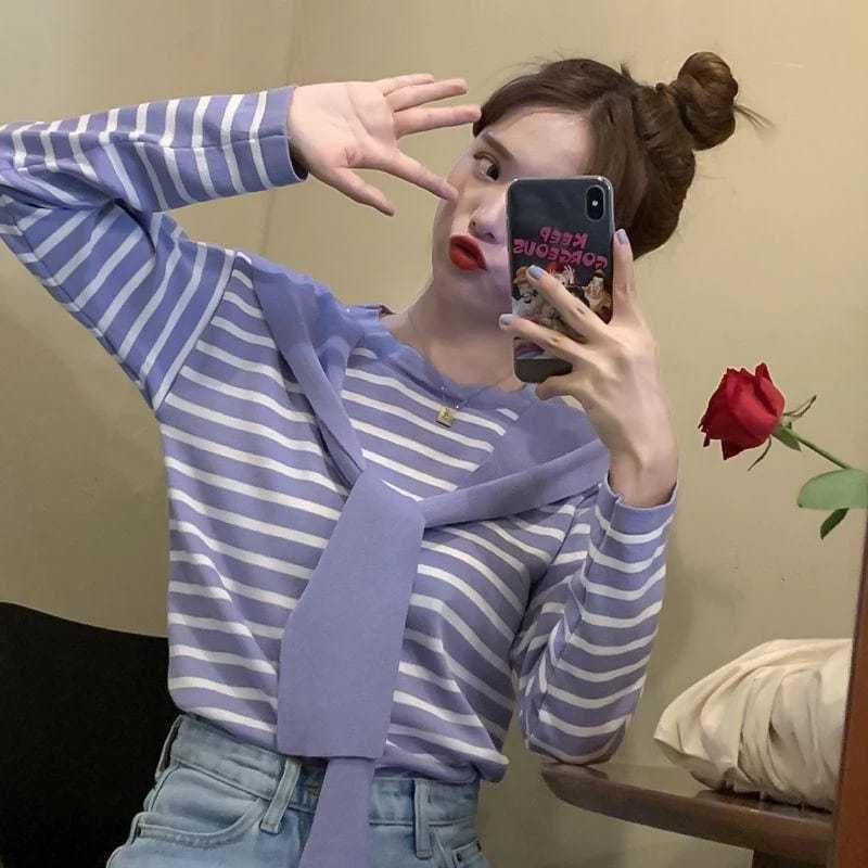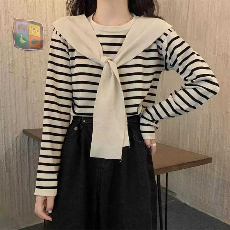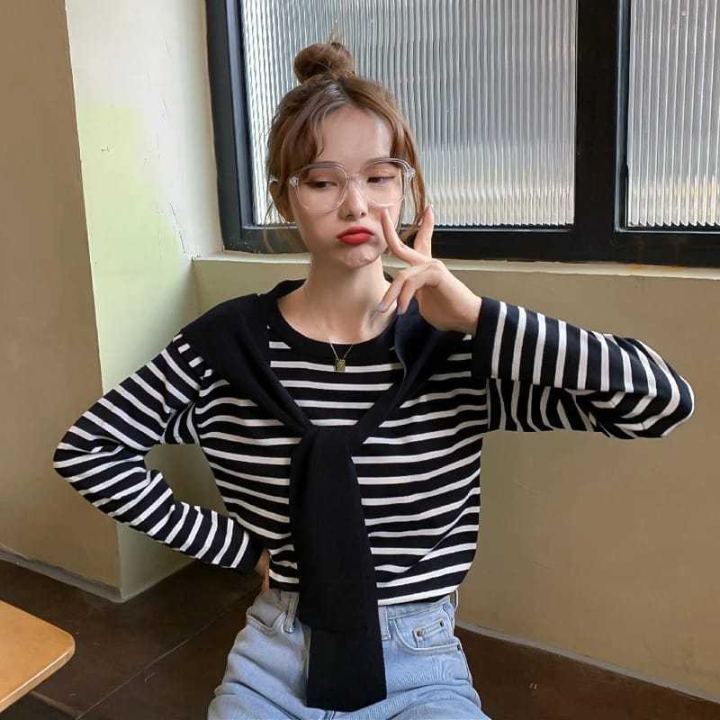 ALIKA Stripe Knit - Atasan Blouse Wanita - Sweater Rajut Syal menyatu