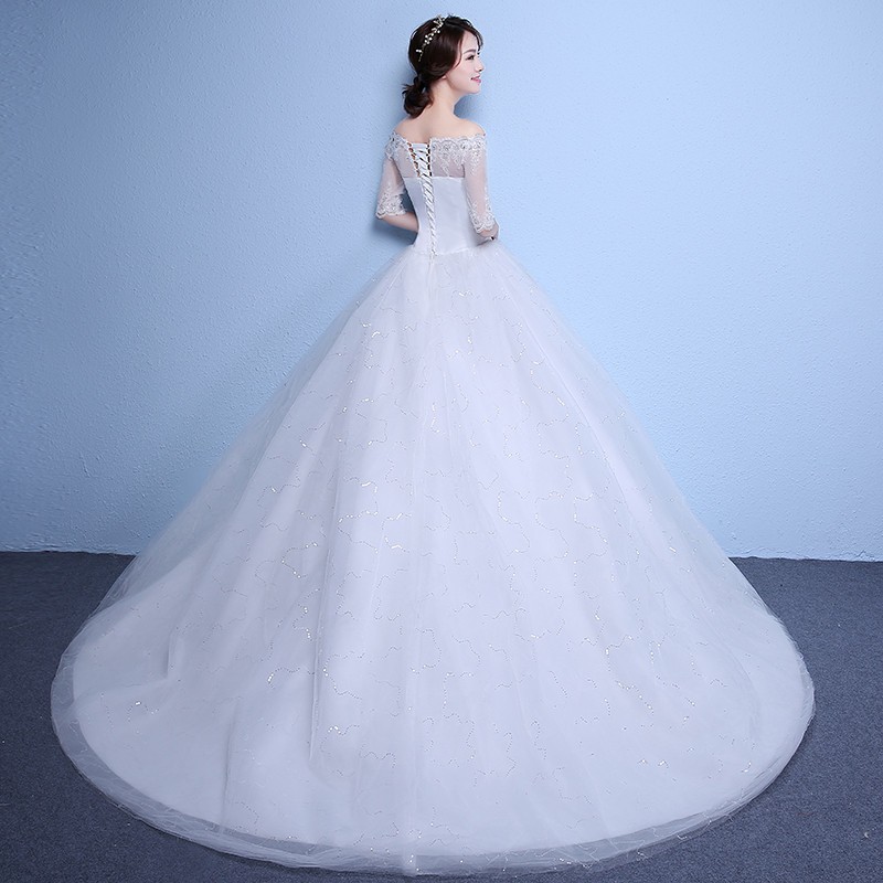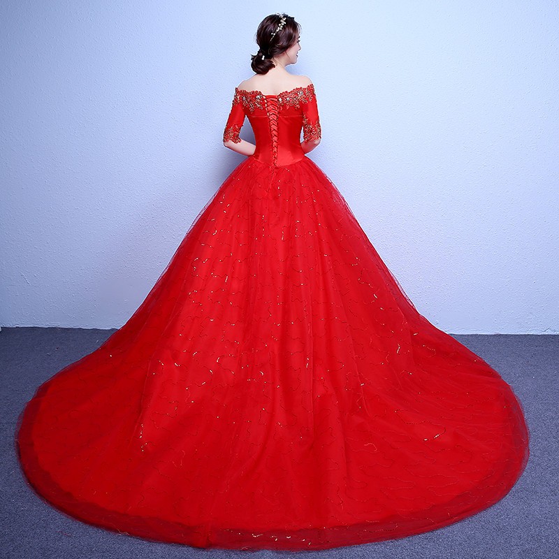 Wanita Gaun Pengantin Renda Putih dan Merh Ekor Panjang Off Shoulder White and Red Lace Beaded Long Tail Wedding Dress B
