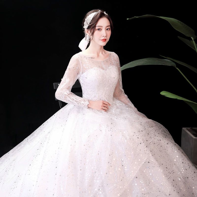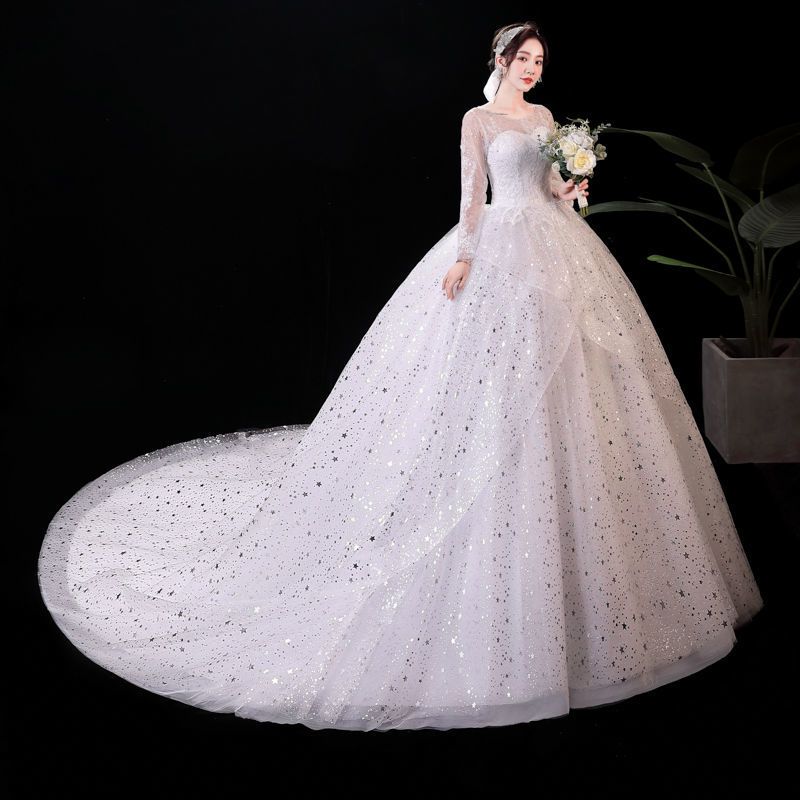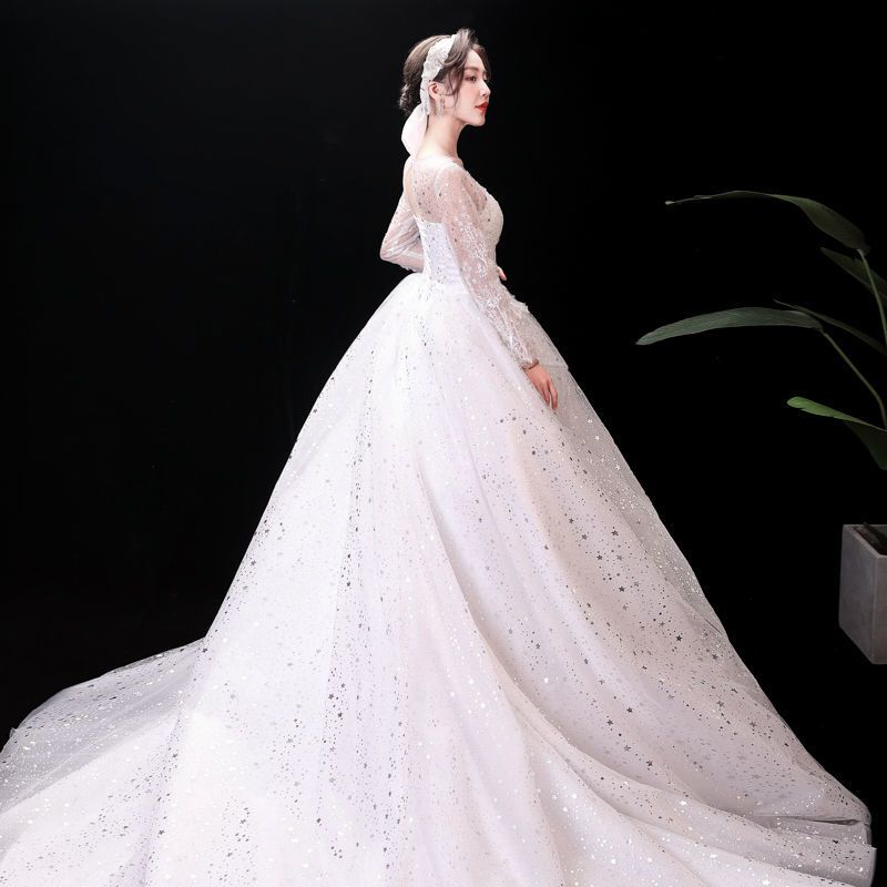 Maxi gaun pengantin renda putih pesta pernikahan Ekor Panjang Long Sleeve Long Tail Women White Lace Wedding Dresses Max