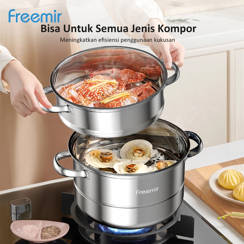 freemir Kukus dan Wajan Panci Rebus Panci Steamer 2 Tingkat Pengukus / Alat Kukus 2 Layer Panci Kukusan Stainless Steel Tutup Kaca