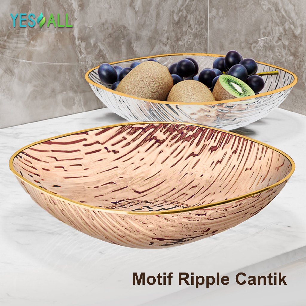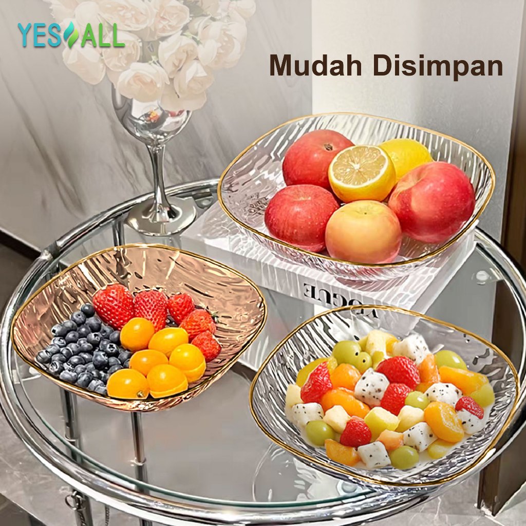 YESALL Piring Saji Kotak Besar 24cm / 20cm Ripple Transparan Mewah Pinggiran Emas – Untuk Buah, Lauk, Salad, Dessert, Sharing Keluarga, Estetik