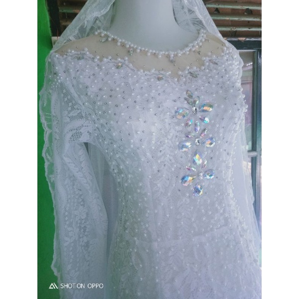 Gaun Akad Mutiara Putih Brukat Dengan Mutiara