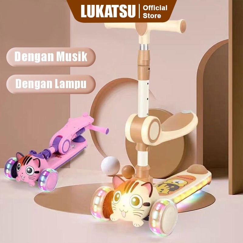 LUKATSU Scooter Anak 3 Roda Bisa Dilipat Dengan Lampu Dan Musik Skuter Harimau Skuter Anak Laki-laki Dan Perempuan