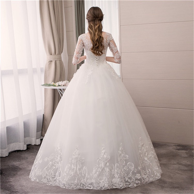 Gaun pengantin putih ball gown lengan panjang wedding gown / gaun lengan sesiku dengan brukat wedding