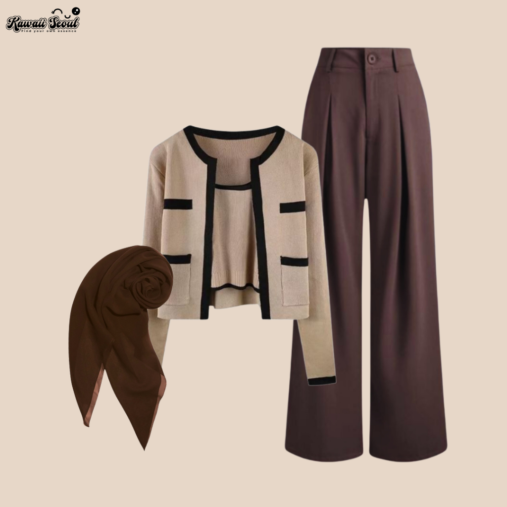 One Set 3in1 Inner Cardigan Korean Style Celana Kulot Knit Hijab Segi Empat Setelan Wanita 218