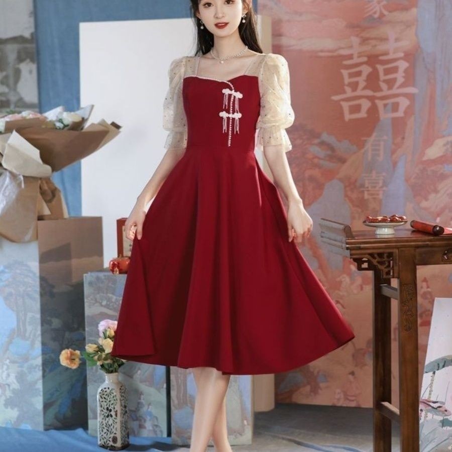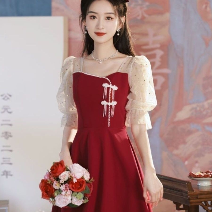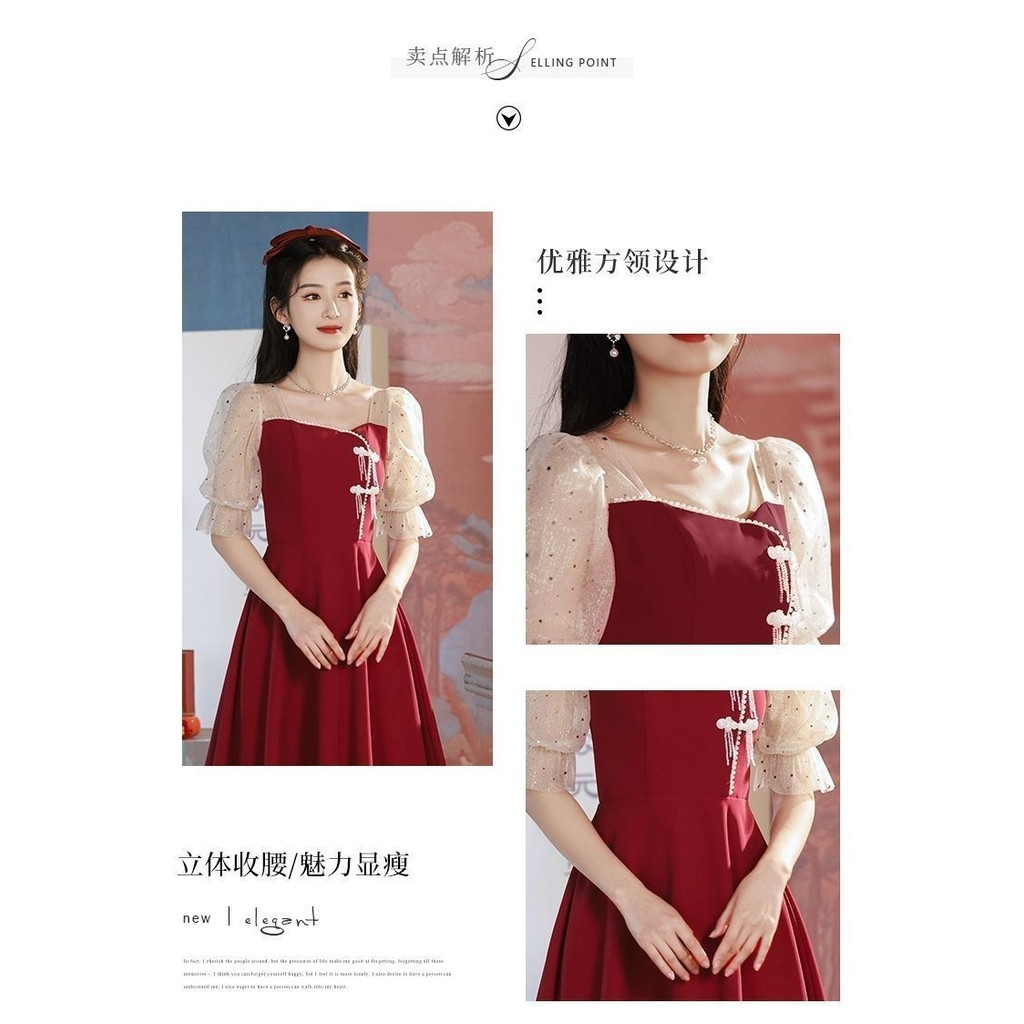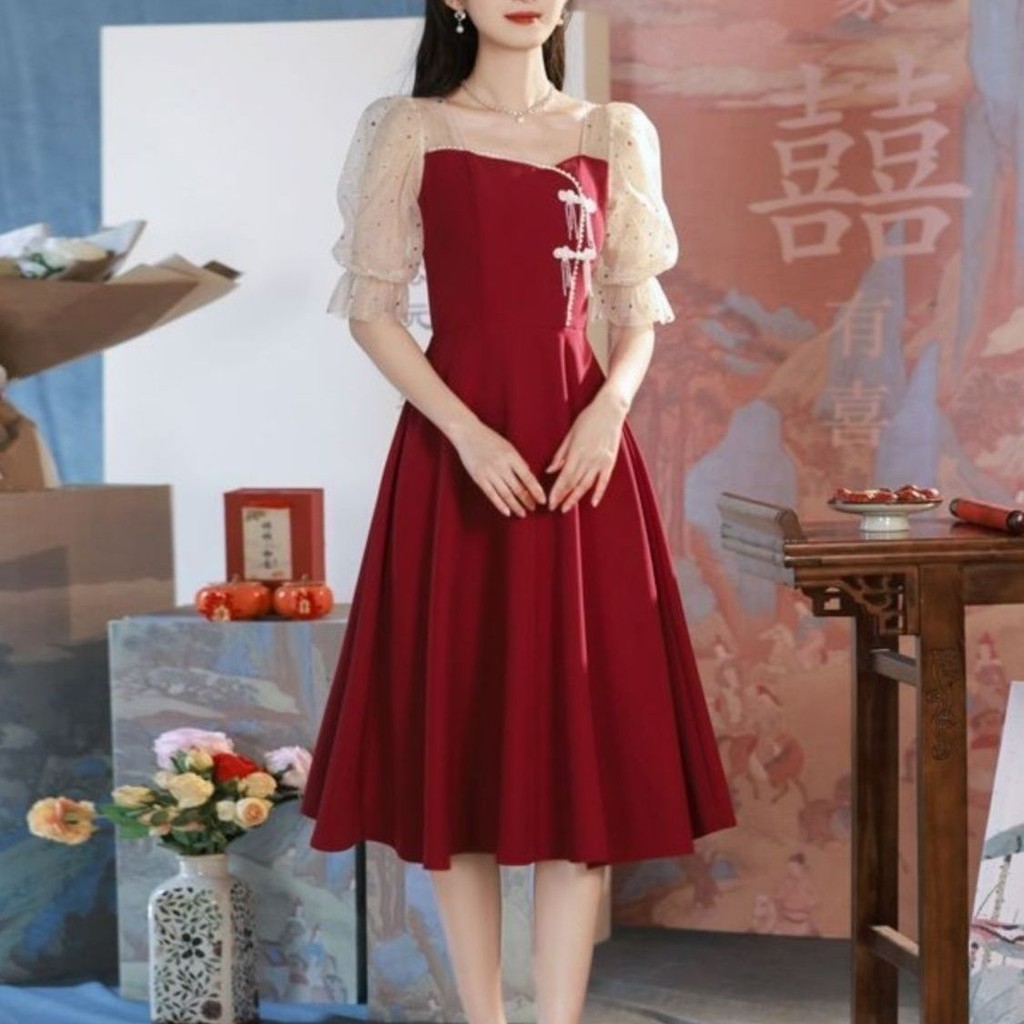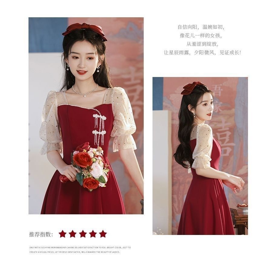 Gaun Toast Pengantin Lengan Kain Merah Dapat Dipakai Sehari-hari Gaun PertunanganGaunPestaPernikahan