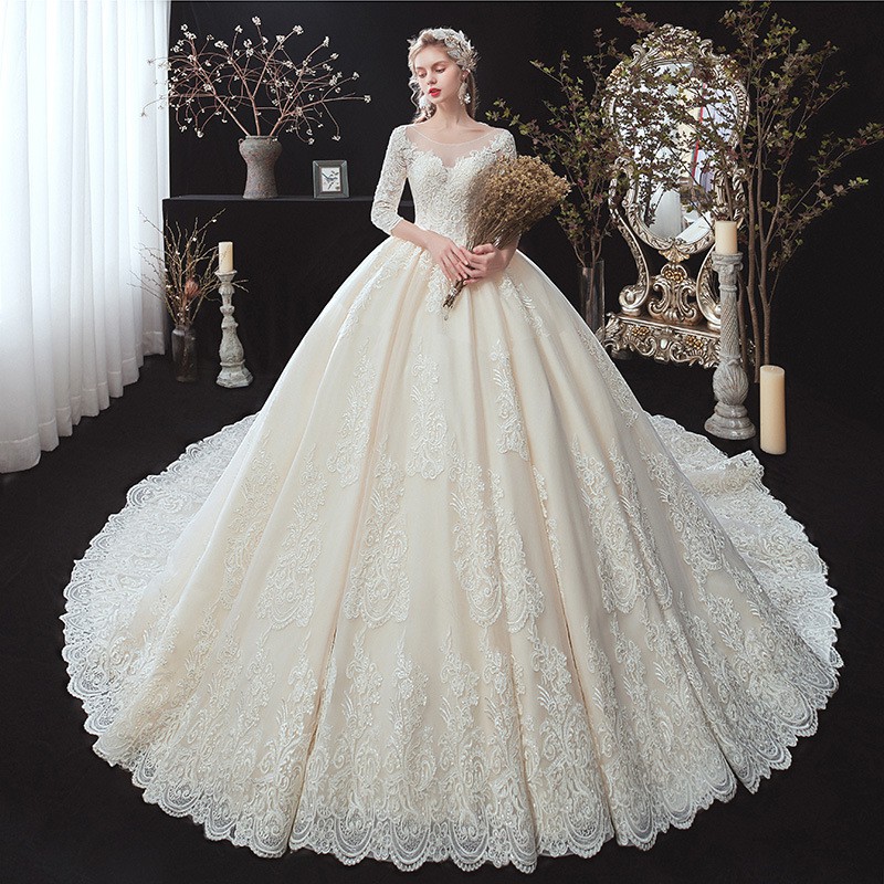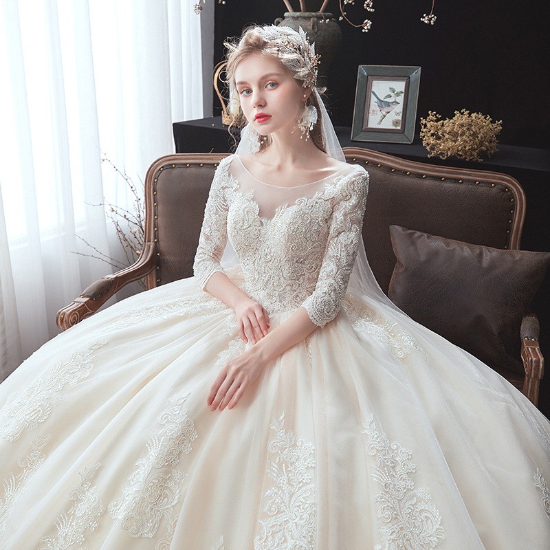 Gaun pengantin custom princess putih gading lengan panjang renda mewah