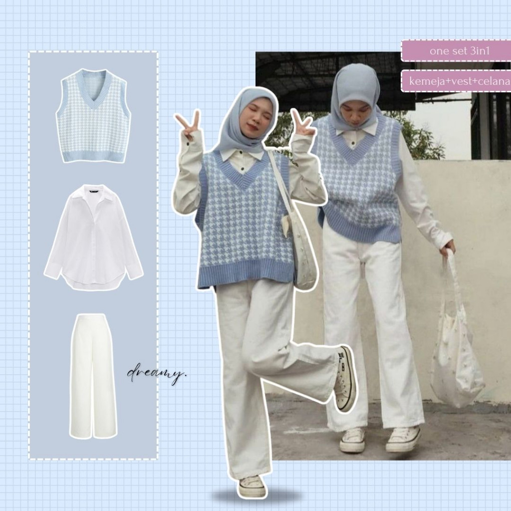 Alina Set 48 - 3in1 Ocean Blue One Set Korean Style, fit Korea, fit Wanita, Ullzang, setelan korea fit ulzzang