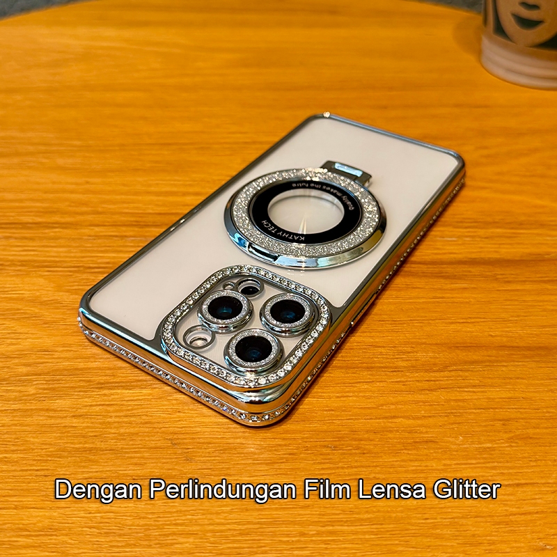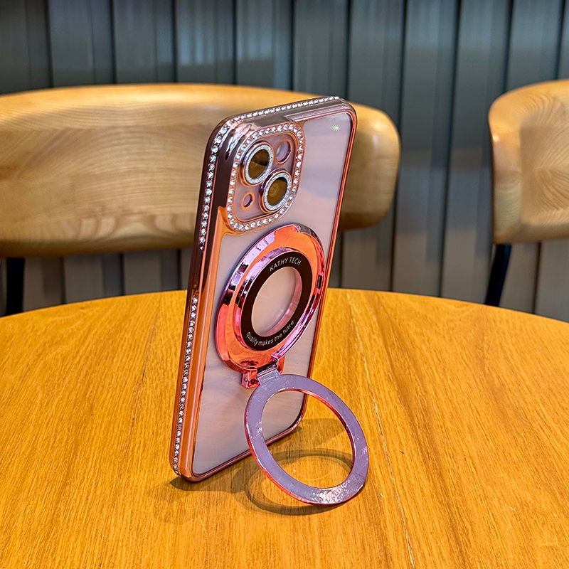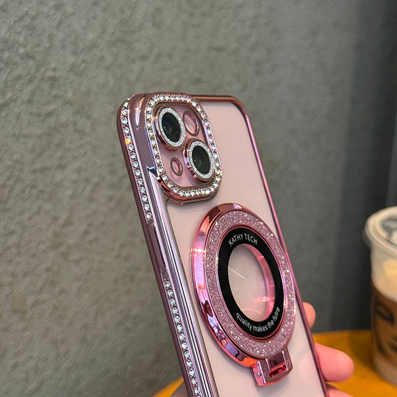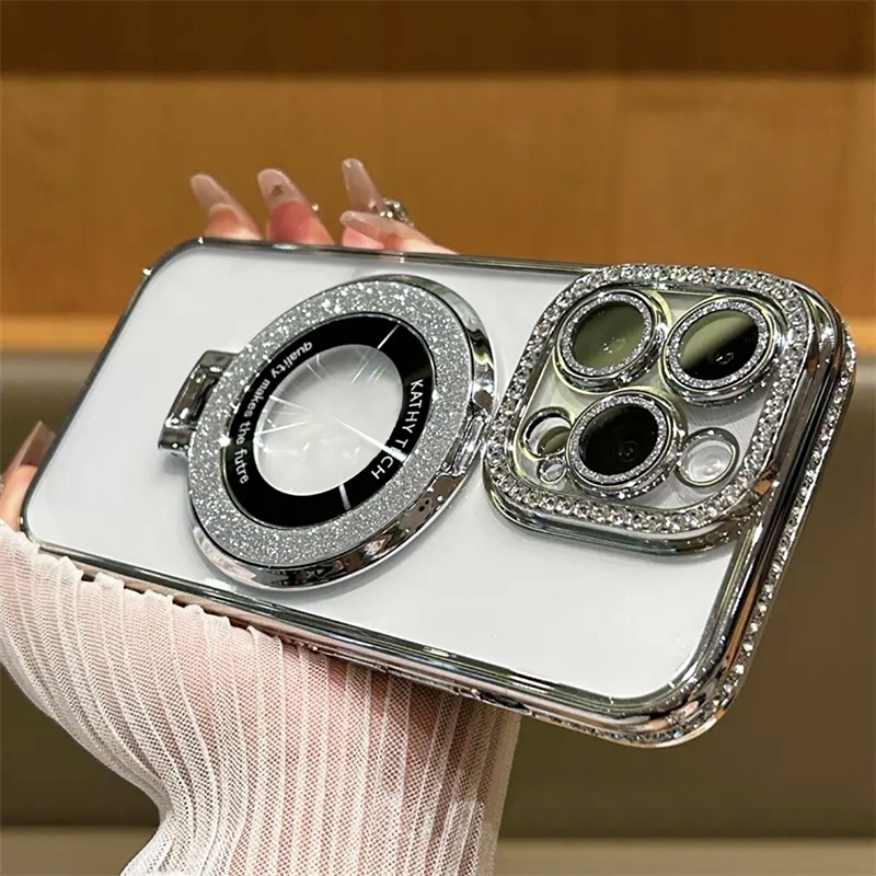 [Star] Glitter Foldable Magsafe Stand Rhinestone Plating Side Transparent Soft Phone Case For iPhone 16 15 14 Pro Max Pl