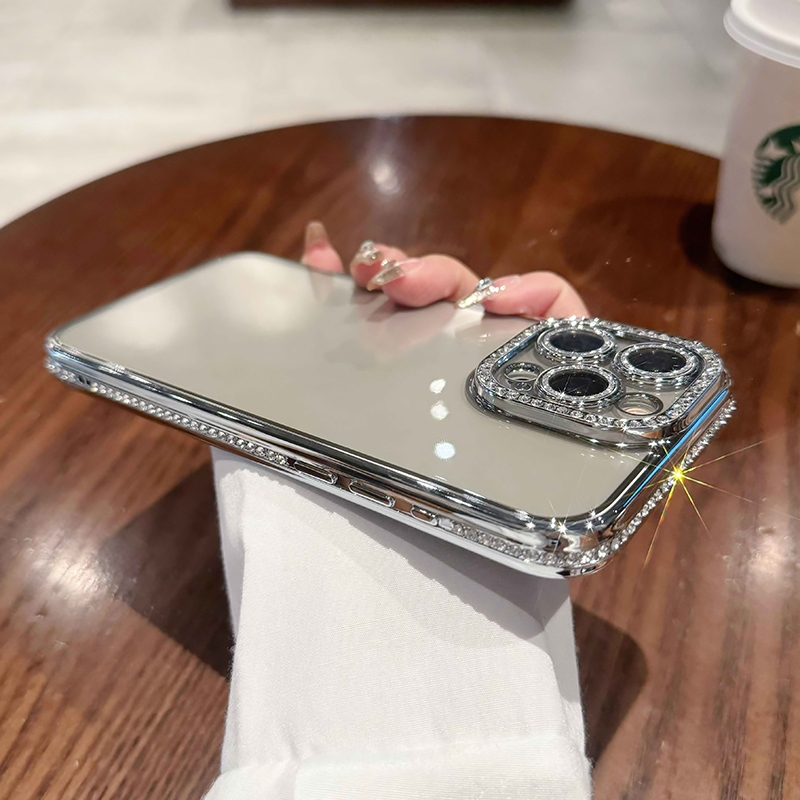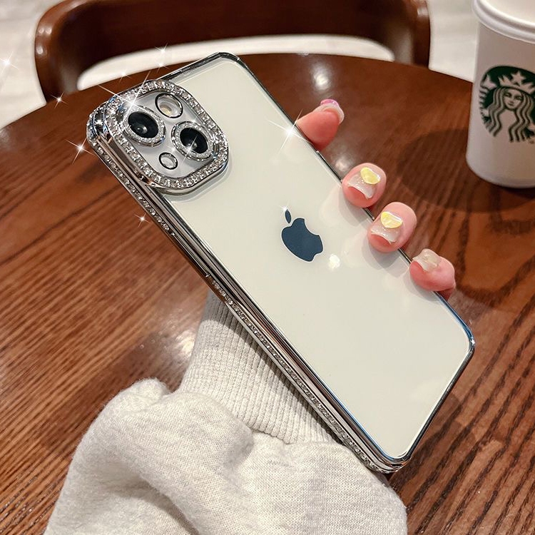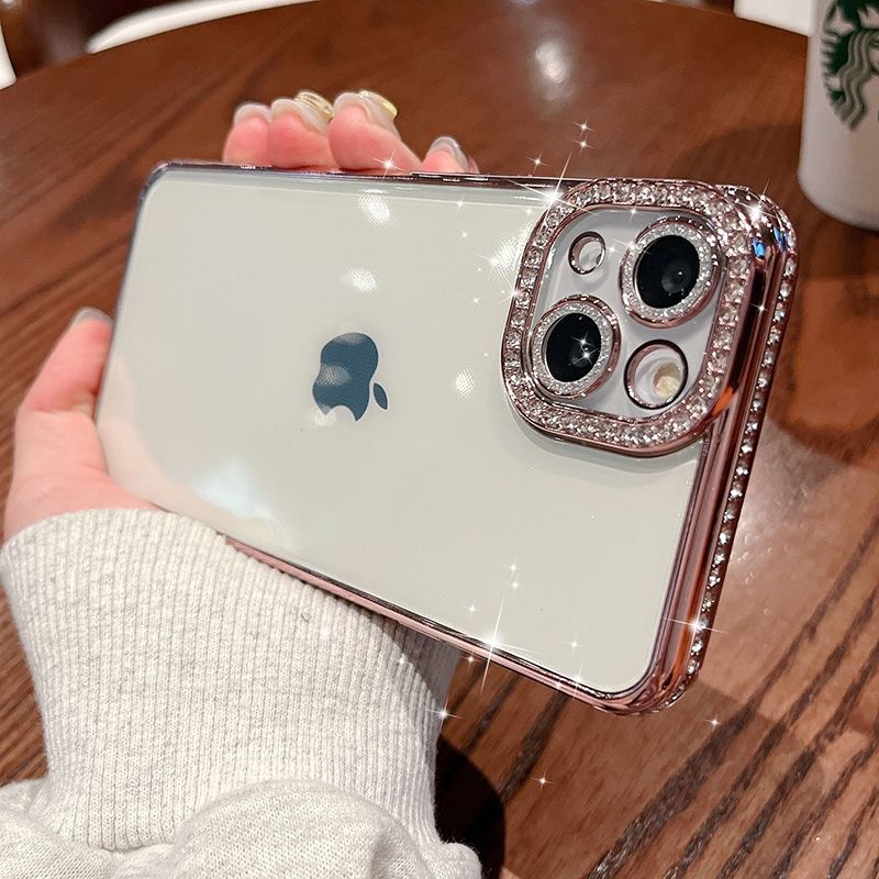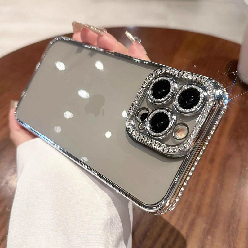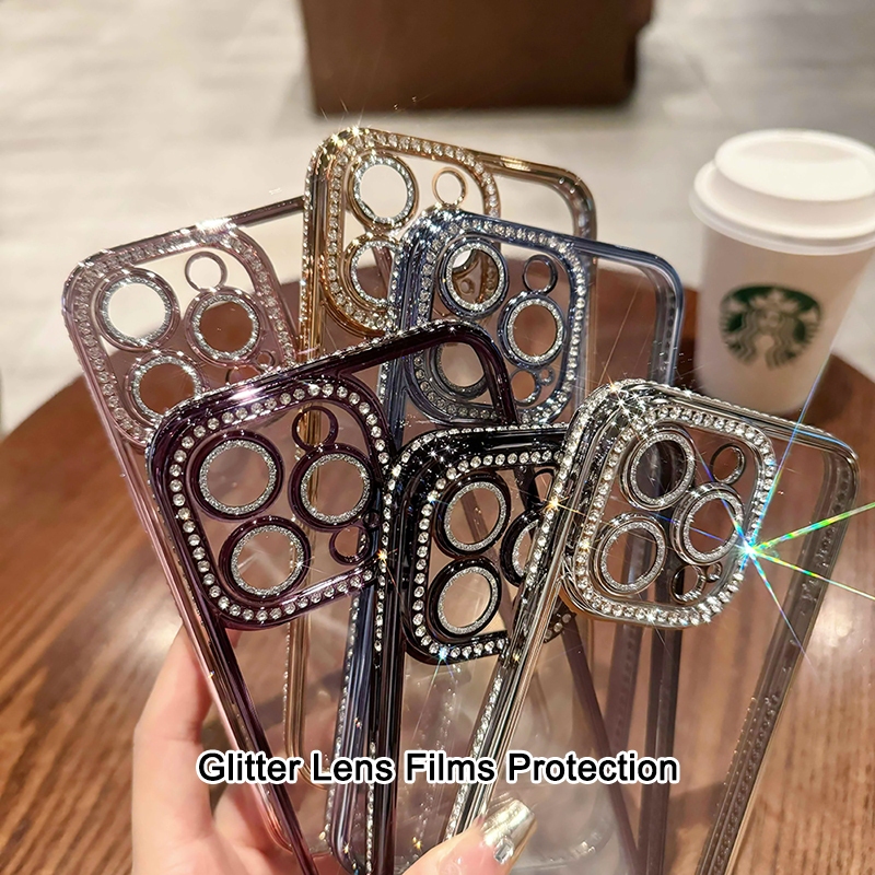 [Star] dimond! Rhinestone Plating Side Transparent Soft Phone Case With Glitter Lens Films Protection For iPhone 16 15