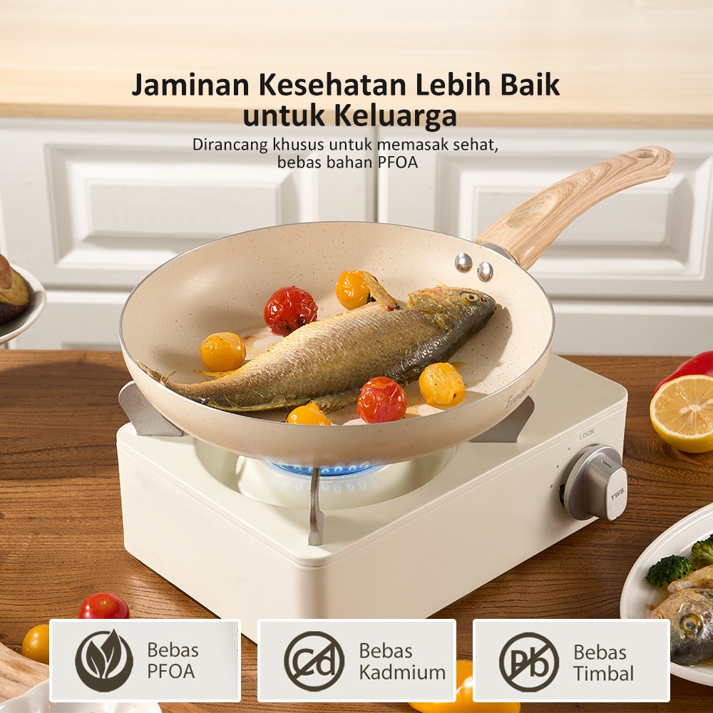 freemir Wajan Penggorengan 24cm Warna Krem Beige Anti Lengket dengan gagang serat kayu