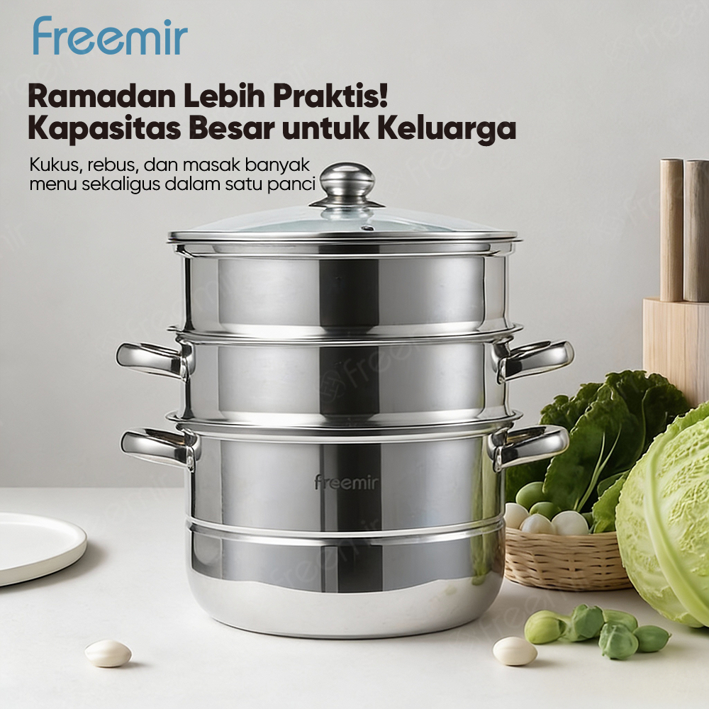 freemir Panci Kukus 3 Susun Stainless 304 - Steamer SNI Medical Grade - Masak Nasi Matang 20 Menit Cocok untuk Sahur