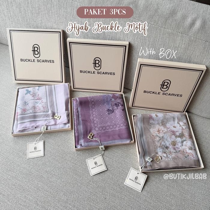 Paket Hijab Isi (3+1Pcs) Box Buckle Scarves | Packaging Box Mewah Voal Muslim Square | Free Goodiebag Kerudung Segi Empa
