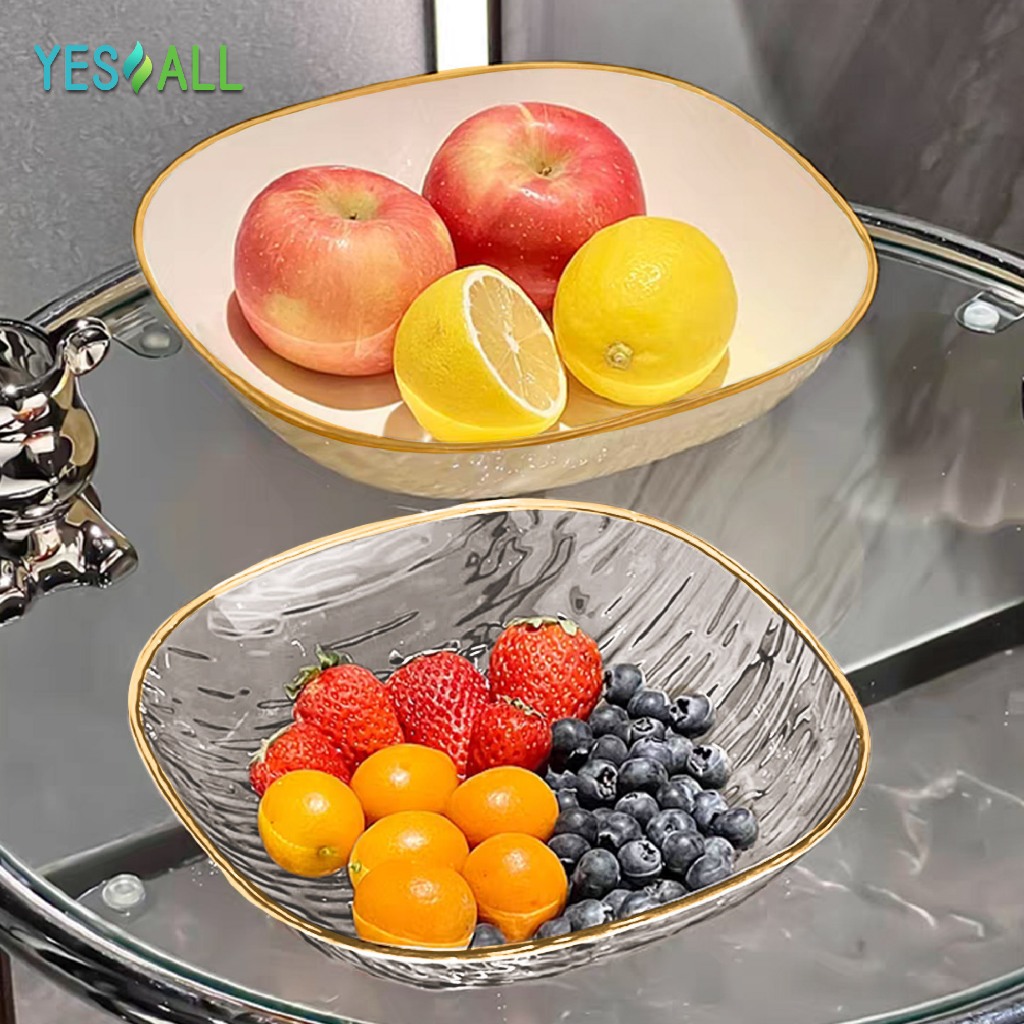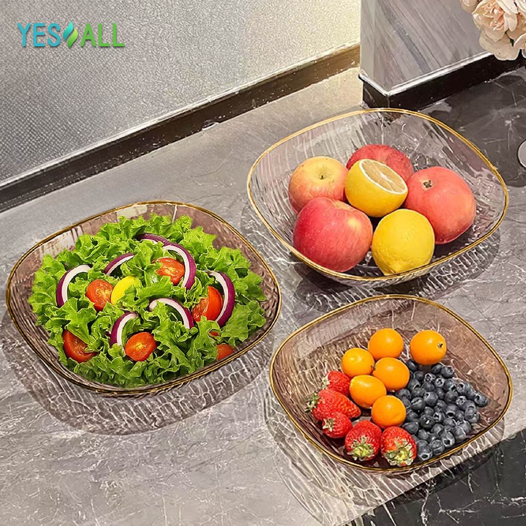 YESALL Piring Saji Kotak Besar 24cm / 20cm Ripple Transparan Mewah Pinggiran Emas – Untuk Buah, Lauk, Salad, Dessert, Sharing Keluarga, Estetik