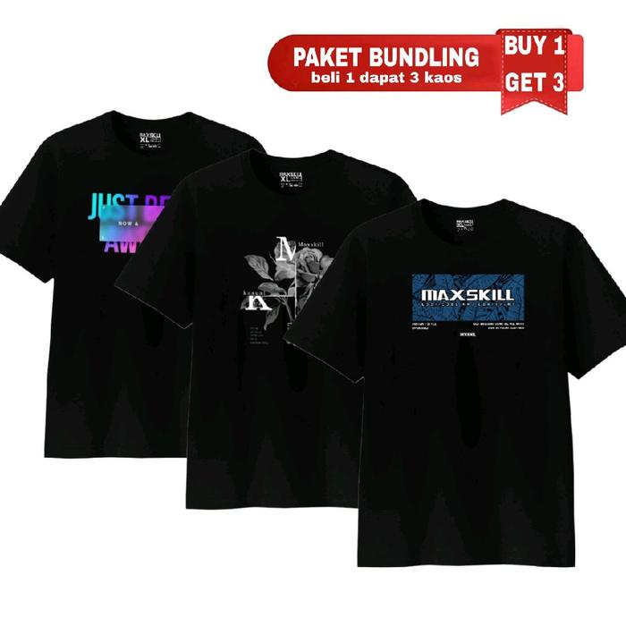 Maxskill Paket Bundling Beli 1 Dapat 3 Leaf Blue+Mxkl Rose+Just Be Awesome T-Shirt Hitam Kaos Distro Cotton Combad 2