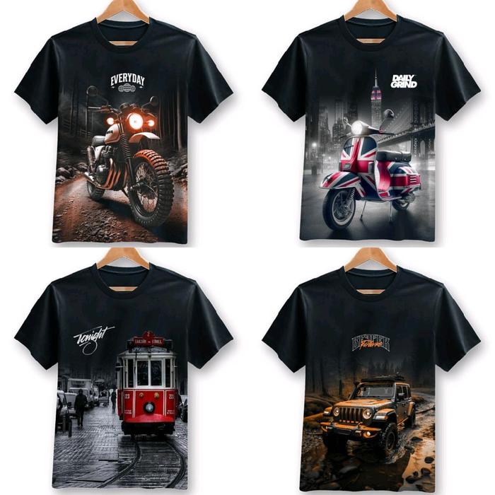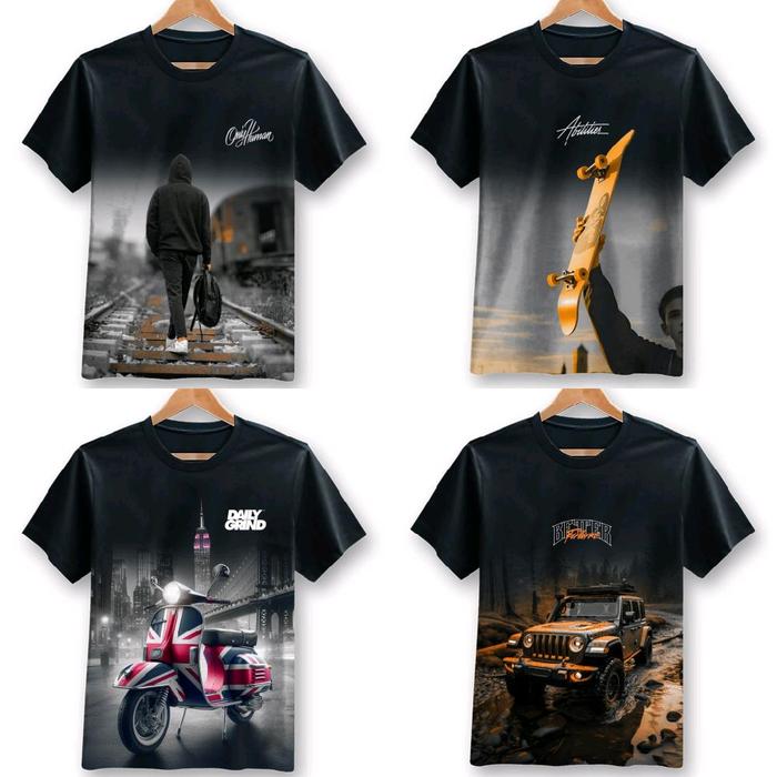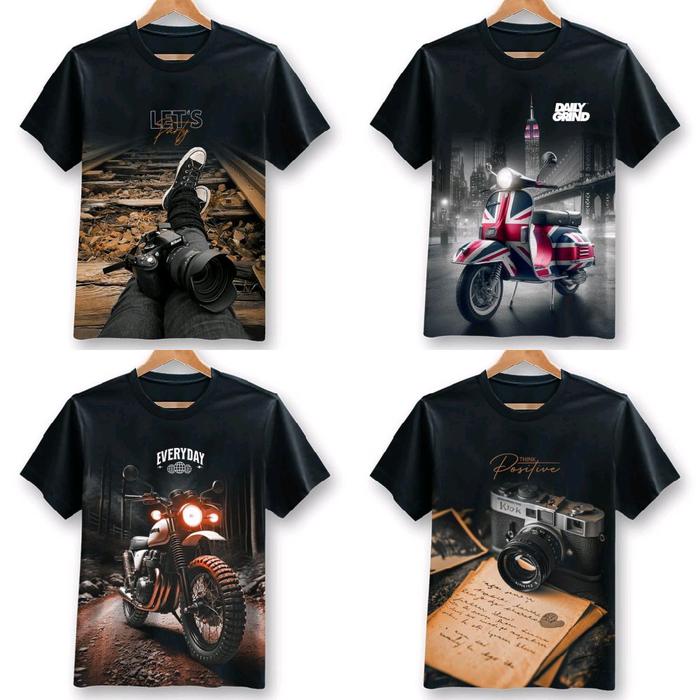 Paket 4 Kaos Distro Hitam Motif Acak Klasik Retro Bahan Semi Katun 24S Atasan Cowok Cewek Keren Dewasa Pendek Oblong Sab