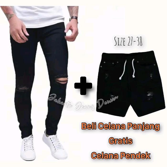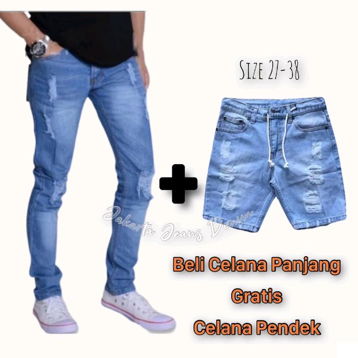 (Paket Hemat Isi 2Pcs)Beli 1 Gratis 1 Celana Pendek-Celana Jeans Pria Motif Sobek-Celana Panjang Cowok Terlaris-Celana P