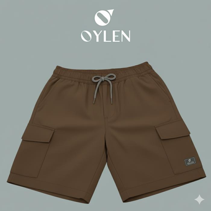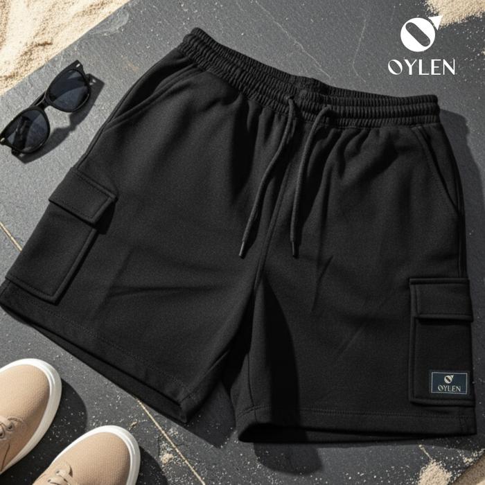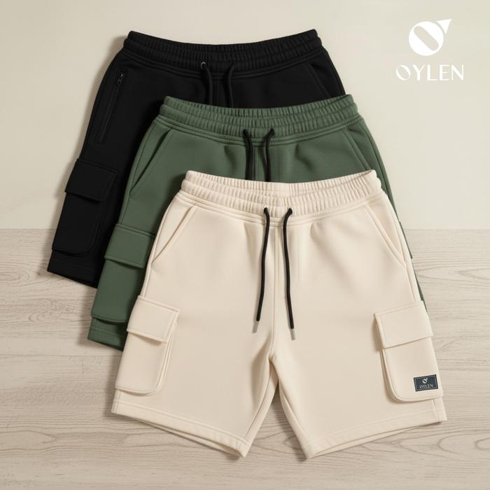 Oylen Paket 3 Pcs Celana Cargo Boardshort Pendek Pria Matt Fleece Tebal Hitam Hijau Coklat Karet Tali Pinggang 2 Saku Sa