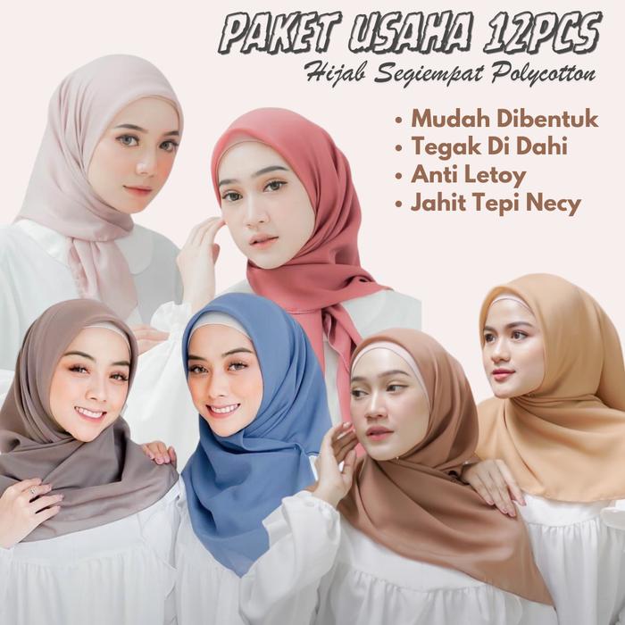 Paket Usaha 12 Pcs Hijab Bella Square Jahit Neci Muslim Wanita Nyaman Polycotton Segi Empat Nyaman Polycotton Kerudung -
