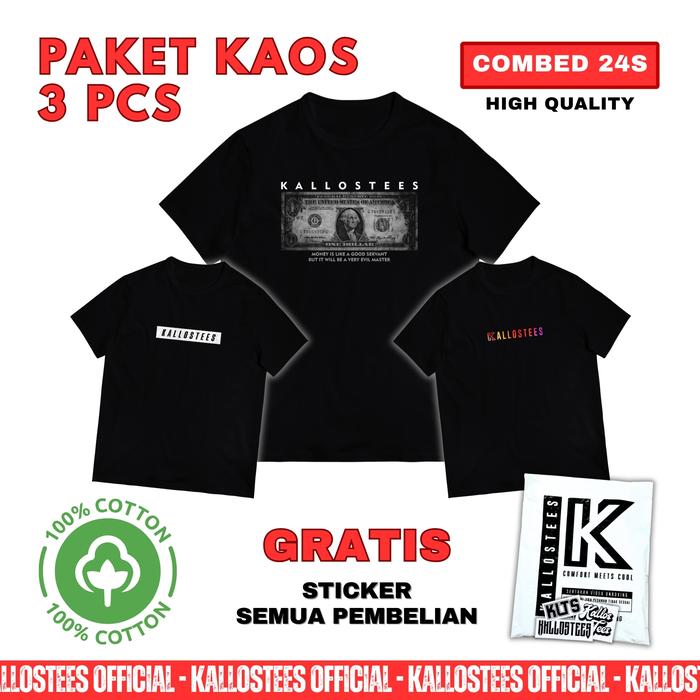 Paket 3 Kaos Kallostees Baju Distro Combed 24S Premium Hitam Pendek 100 PERSEN Katun Pria Unisex Free Sticker - Bundling 1, S