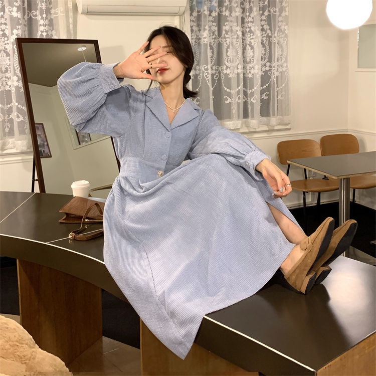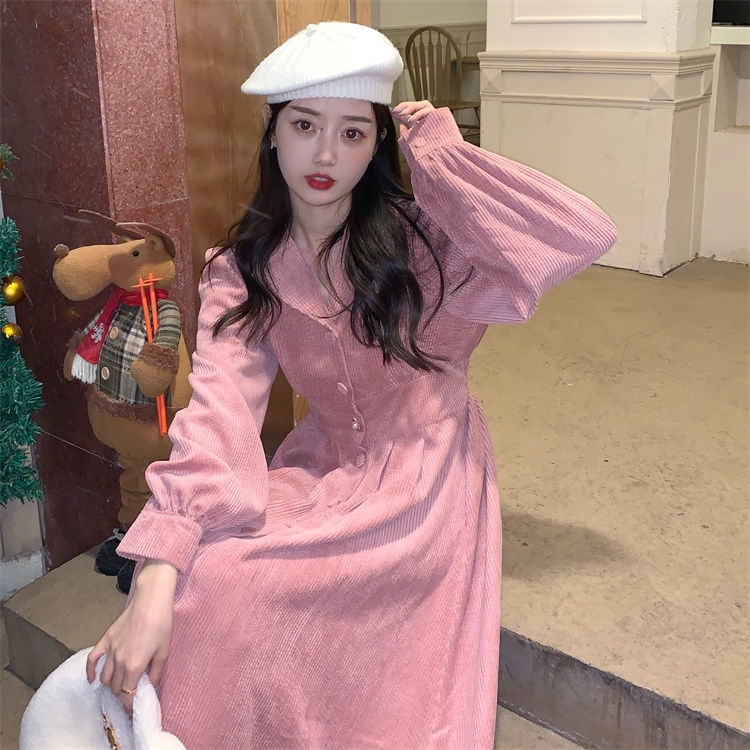 YURUMA Corduroy Dress French Suit Collar Design Sweet Long Dress